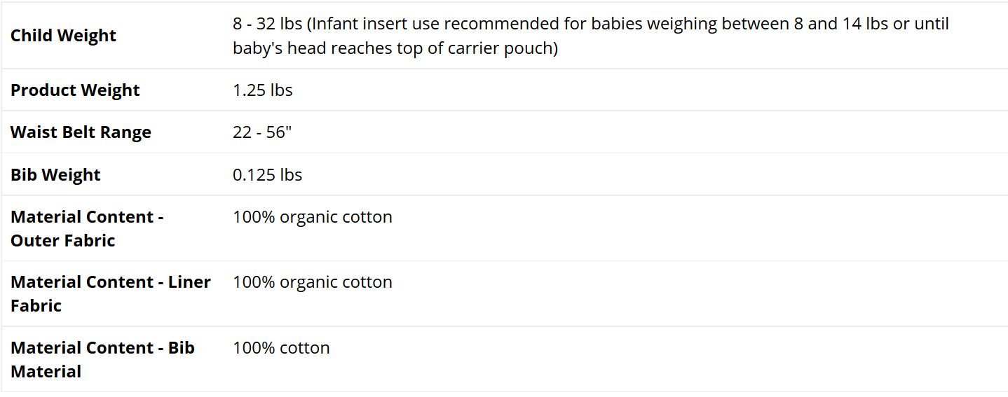When it comes to carrying your baby, at Britax we know that the comfort of both parent and child are crucial. That’s why Britax, the leader in child safety, has designed the Britax Baby Carrier to provide the highest level of long-wearing comfort for both you and your growing baby. The Britax Baby Carrier features the carrylong system, which reduces the risk of back and shoulder strain during extended wear by distributing weight across the shoulders, back and hips. Not only does the Britax Baby Carrier offer superior levels of comfort, but it is versatile as well. The ergonomic carrier allows you to face your baby inward towards you or outward to face the world, and accommodates infants from 8 pounds to toddlers up to 32 pounds. Along with comfort and versatility, the Britax Baby Carrier was engineered for simple daily use. An over-the-head design makes it easy to get the carrier on and off, one-handed buckles and snaps simplify getting your child in and out of the carrier, and both the harness and waist belt straps have been constructed for easy adjustment. Coming from the leader in child safety, the Britax Baby Carrier has been engineered for safety as well. Adjustable head support and leg loops provide head and neck stability for younger infants and a secure fit for smaller babies. A secure harness and pouch design ensures that baby will stay securely within the carrier. With the Britax Baby Carrier carrying your growing baby has never been more comfortable or easy. Made with 100% organic cotton fabric.