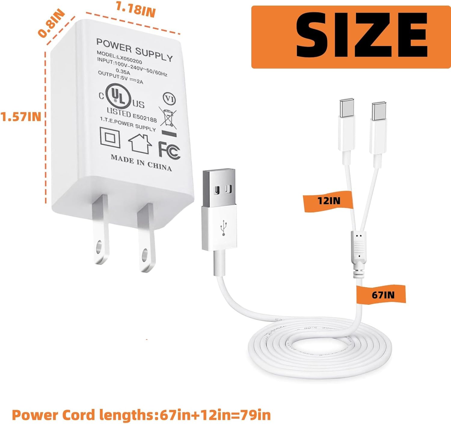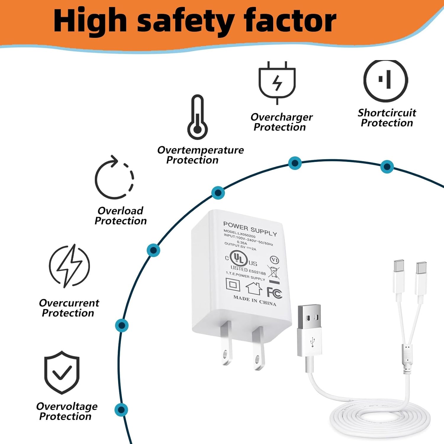 【Product Information】Input Voltage AC100-240V; Output voltage: DC5V ;Output line length: 6.5FT; Fireproof PC Shell (more secure)+ Pure Copper Core (Longer Service Life)
