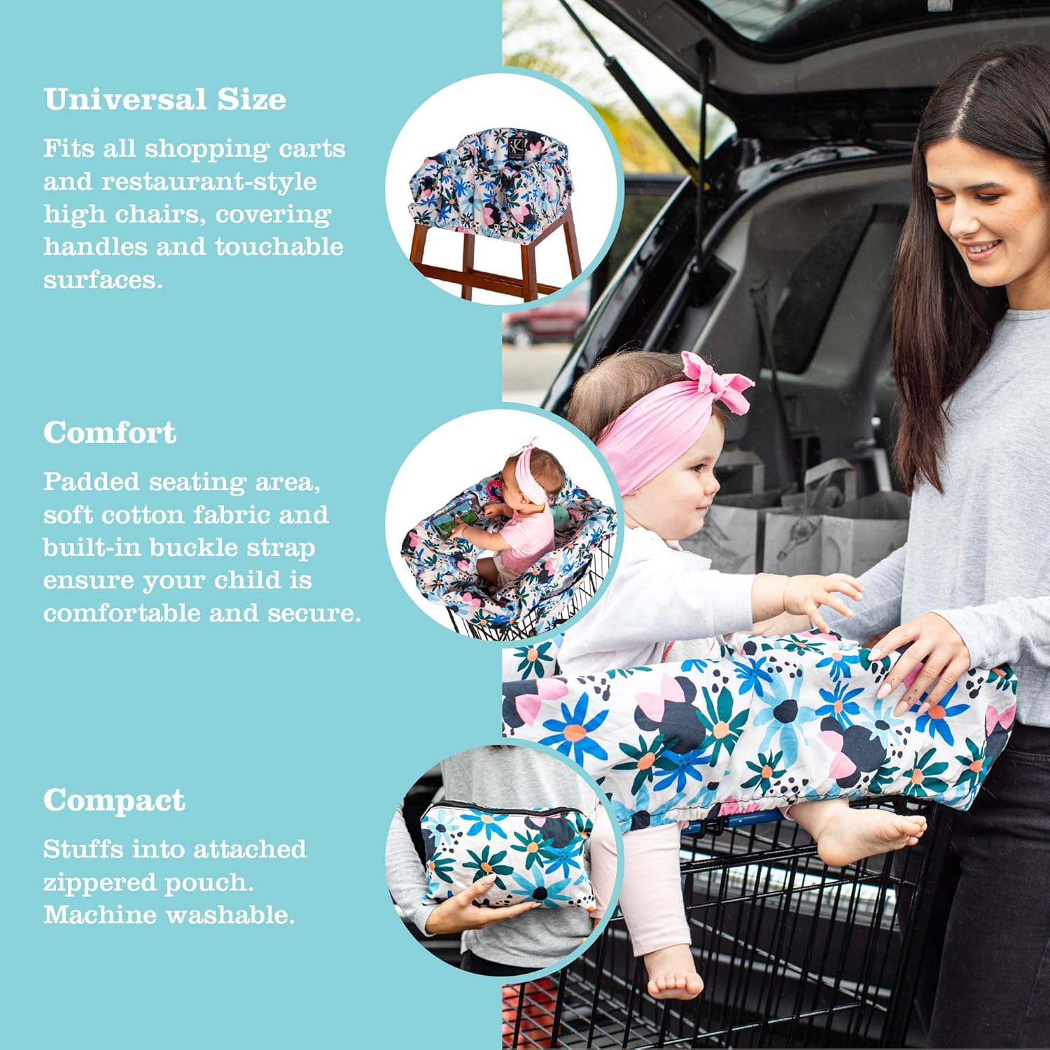 FOR SHOPPING CARTS AND HIGH CHAIRS: Universal, extra-large baby seat cover fits ALL shopping carts and restaurant-style high chairs, covering handles and touchable surfaces