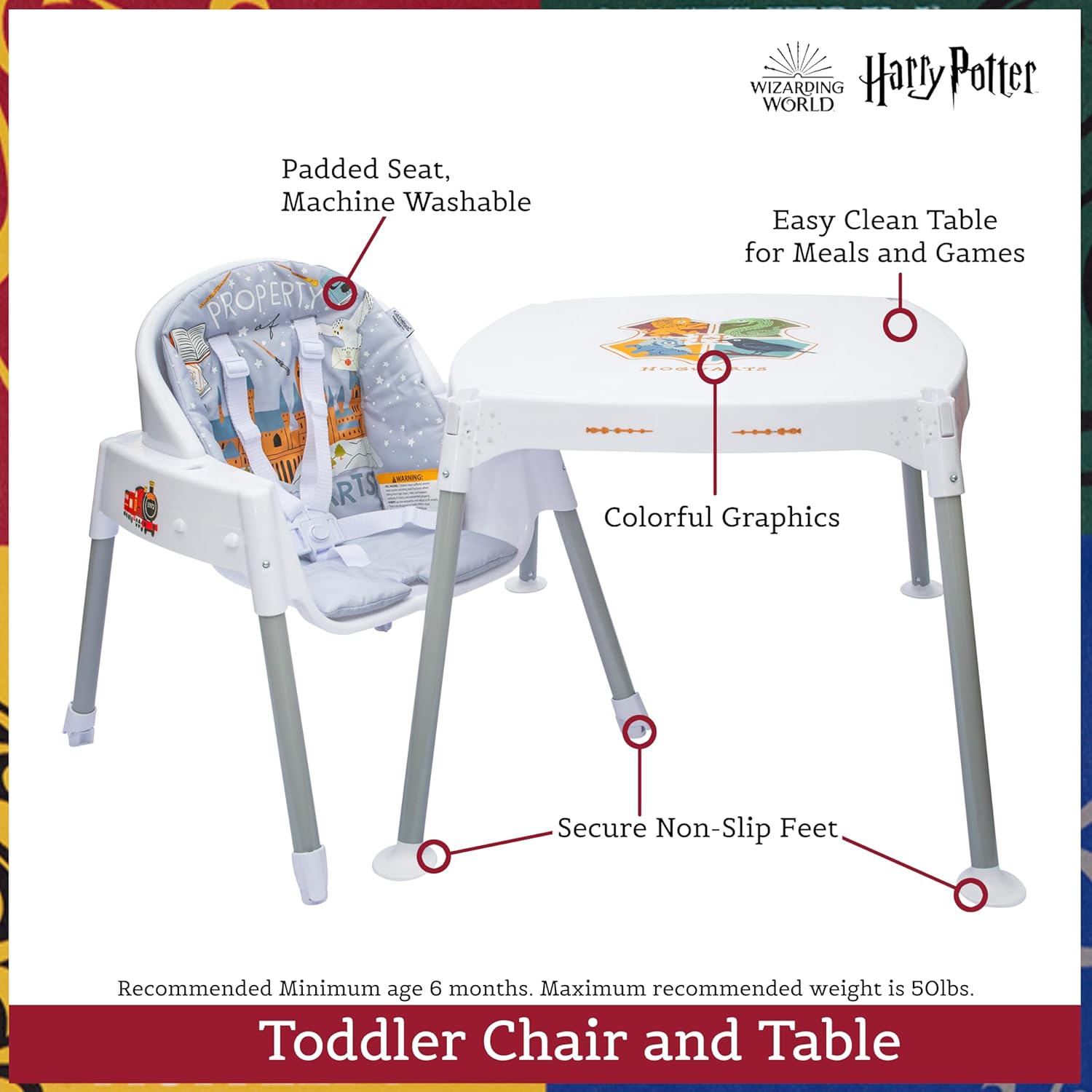 Step into the Wizarding World of Harry Potter with our Enchanted 4-in-1 High Chair, designed to bewitchingly cater to children and transform from a highchair into a magical toddler table & chair set for growing wizards up to 50lbs. From feeding spells in the Infant highchair to the enchanting freedom of a personalized table and chair, this journey will delight your little wizard as they grow in comfort and safety. Easy cleaning and assembly will keep you from missing the train. Recommended Minimum age 6 months. Maximum recommended weight is 50lbs. Offical Harry Potter Licensed Product. Manufactured by KidsEmbrace.