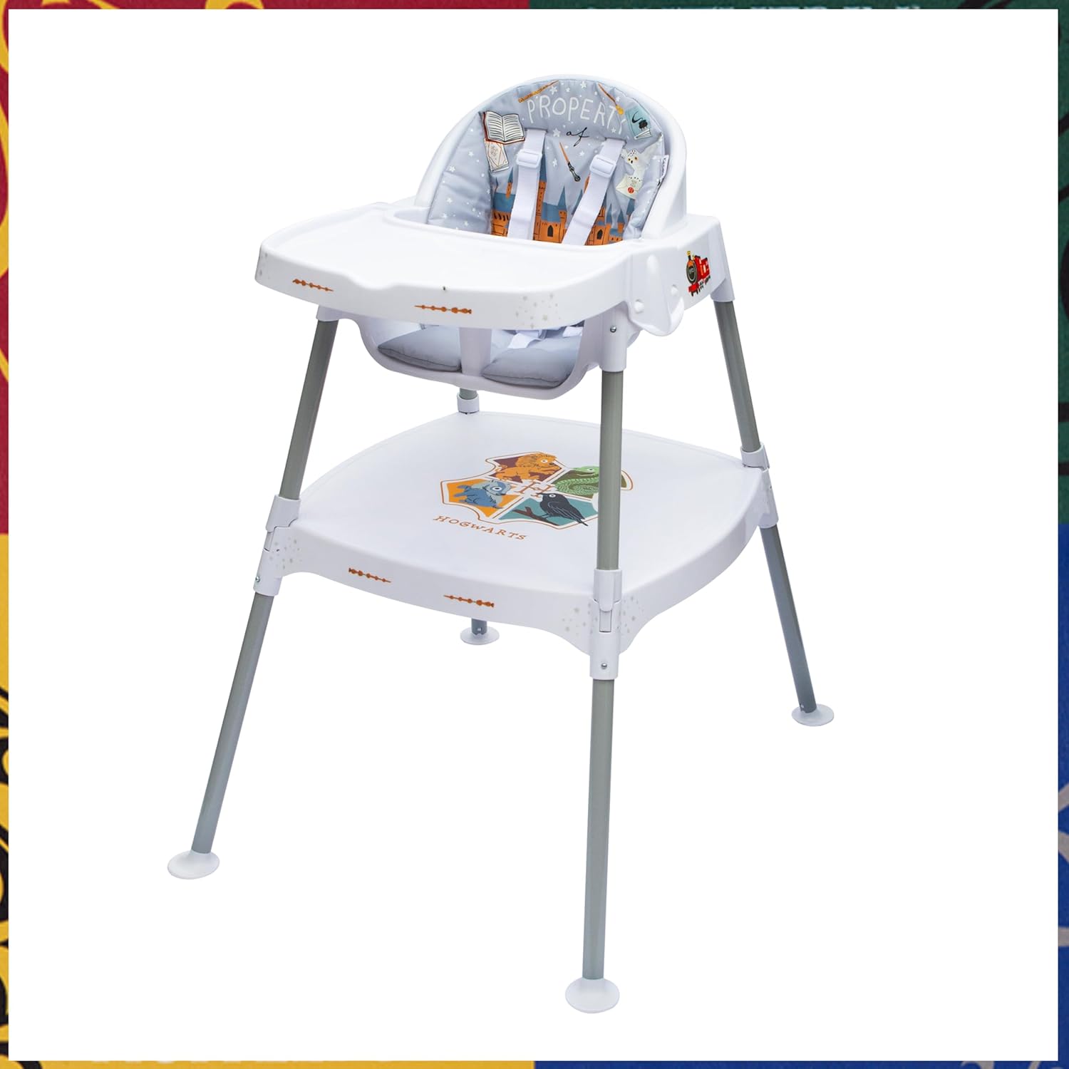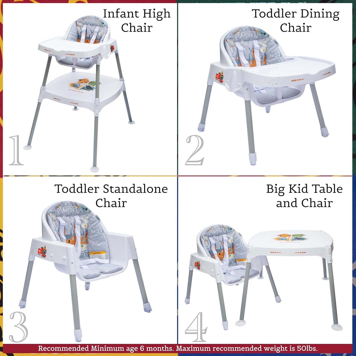 Step into the Wizarding World of Harry Potter with our Enchanted 4-in-1 High Chair, designed to bewitchingly cater to children and transform from a highchair into a magical toddler table & chair set for growing wizards up to 50lbs. From feeding spells in the Infant highchair to the enchanting freedom of a personalized table and chair, this journey will delight your little wizard as they grow in comfort and safety. Easy cleaning and assembly will keep you from missing the train. Recommended Minimum age 6 months. Maximum recommended weight is 50lbs. Offical Harry Potter Licensed Product. Manufactured by KidsEmbrace.