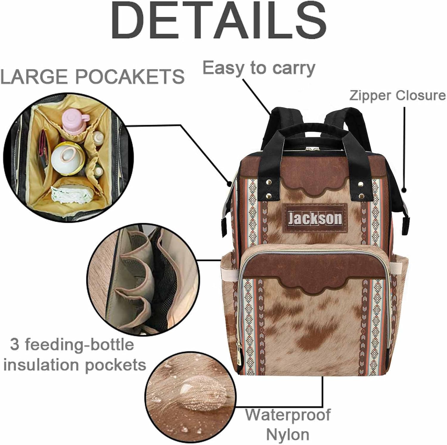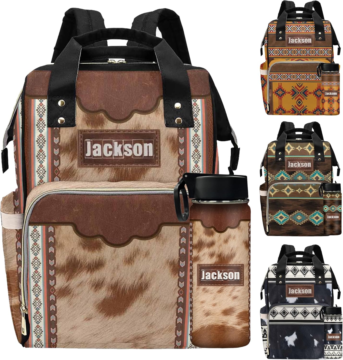 InterestPrint Personalized Large Capacity Diaper Bags Western Cowhide Print with Bottle Custom Name Backpack Casual Daypack Bag Nappy Bag Gifts
