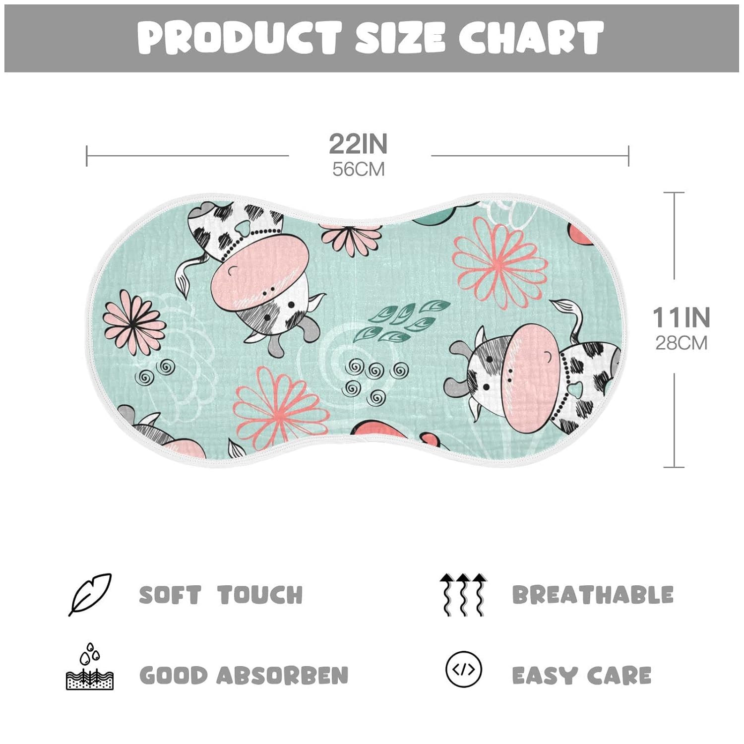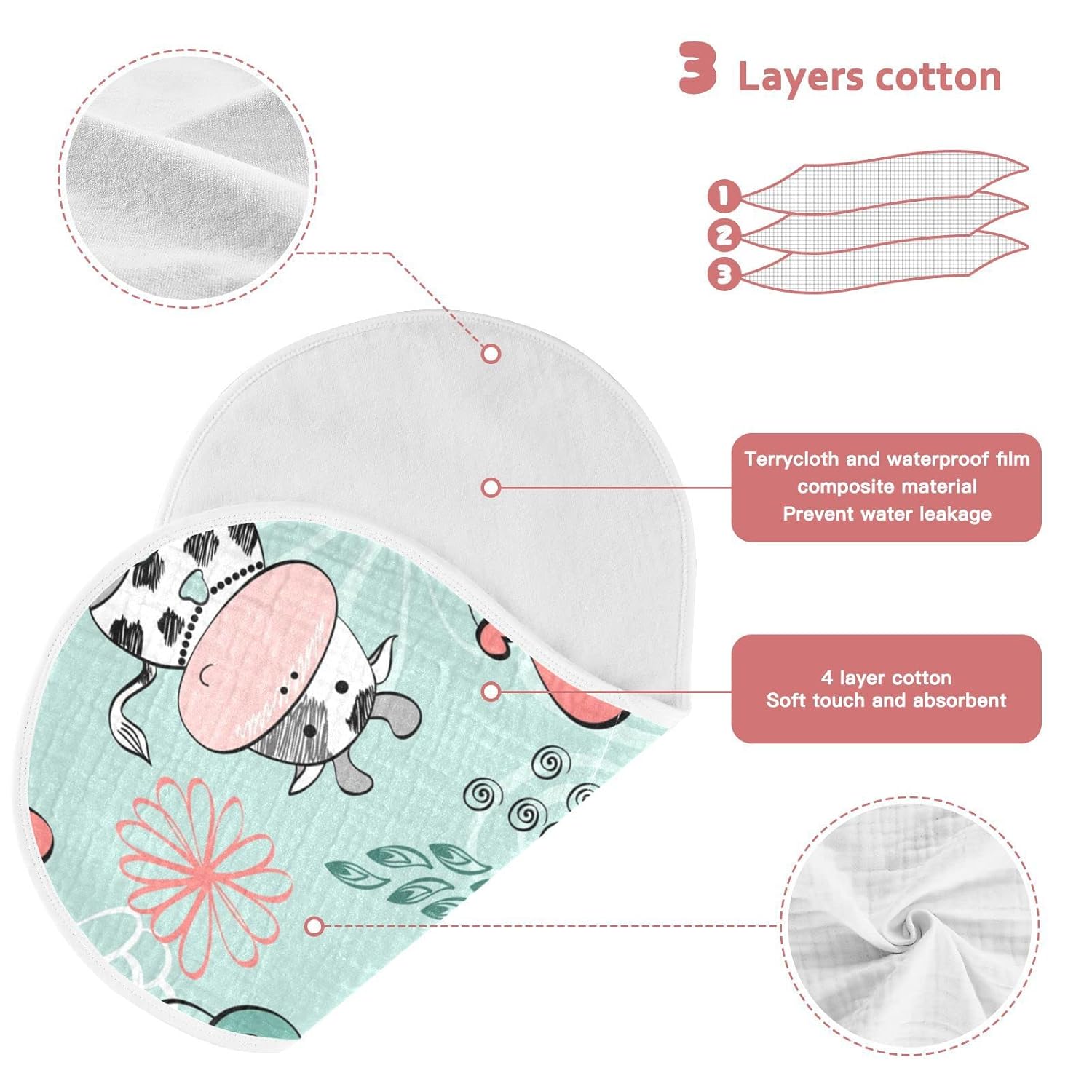 MULTI-PURPOSE: The burp Cloths made of pure cotton cotton yarn fabric, 4 layers of cotton yarn, soft and thick, good water absorption; can be used as a large bib, drooling towel, face towel, anti-spit-up towel, etc. The cute pattern and neutral colors are a must for fashionable parents.