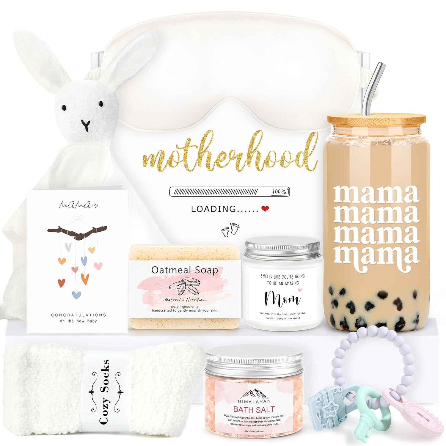 Mommy Care Package After Baby: This new mom self-care gift includes a “Mama” glass can, Himalayan bath salts, a lavender-scented candle, oatmeal soap, an eye mask, cozy socks, a muslin bunny pacifier, food-grade silicone teether, and a new mom greeting card. All beautifully packaged in a charming new mom-themed gift box, making it a perfect last-minute gift!