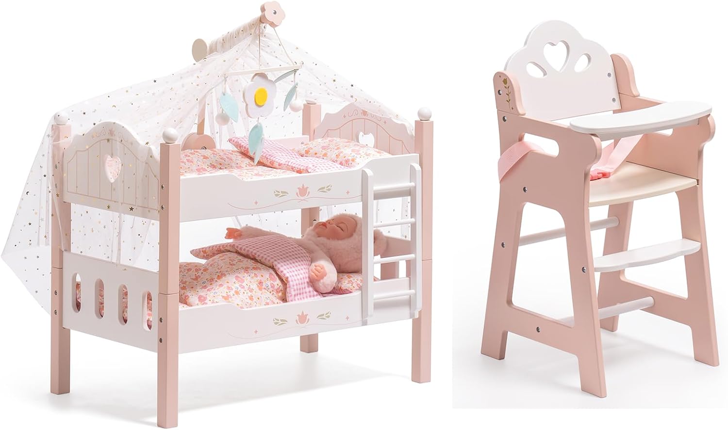 Complete Doll Furniture Bundle – This value-packed set includes a charming baby doll bunk bed and a matching high chair, perfect for pretend play and caring for favorite 18-inch dolls. Ideal for toddlers who love role-playing bedtime and mealtime routines.