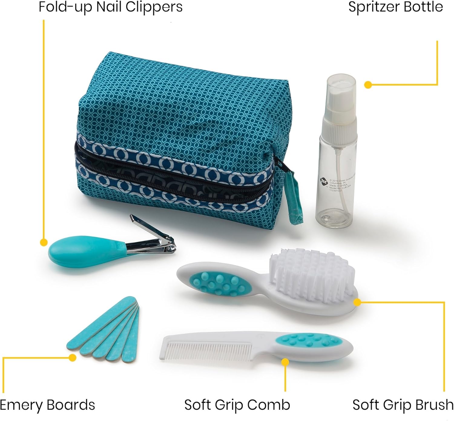 The 1st Grooming Kit by Safety 1st contains the essential baby grooming items you’ll want to have on hand while on the go. This kit gives you a stylish and easy way to keep these items organized with a zippered storage case to keep everything safely inside. The carrier also easily reverses from a standard pouch to a pencil style case. With a soft-grip brush and comb for children, fold-up nail clippers, and more; you’ll be prepared wherever the road takes you.