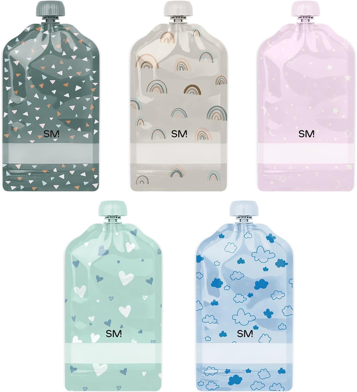 Perfect for All Ages: Our US patent pending food pouches are durable and freezer safe. They are made from material that is BPA, PVC, lead and phthalate free. Easy to Fill and Seal: The double zipper opening allows for easy filling and leakproof storing of food. Easy to Clean: After each use, rinse thoroughly with warm water through the bottom zipper and top spout and then run through the dishwasher – top rack only. 5 Fun Designs: Get two versions of 5 designs for kids. 10 total pouches come with your purchase.