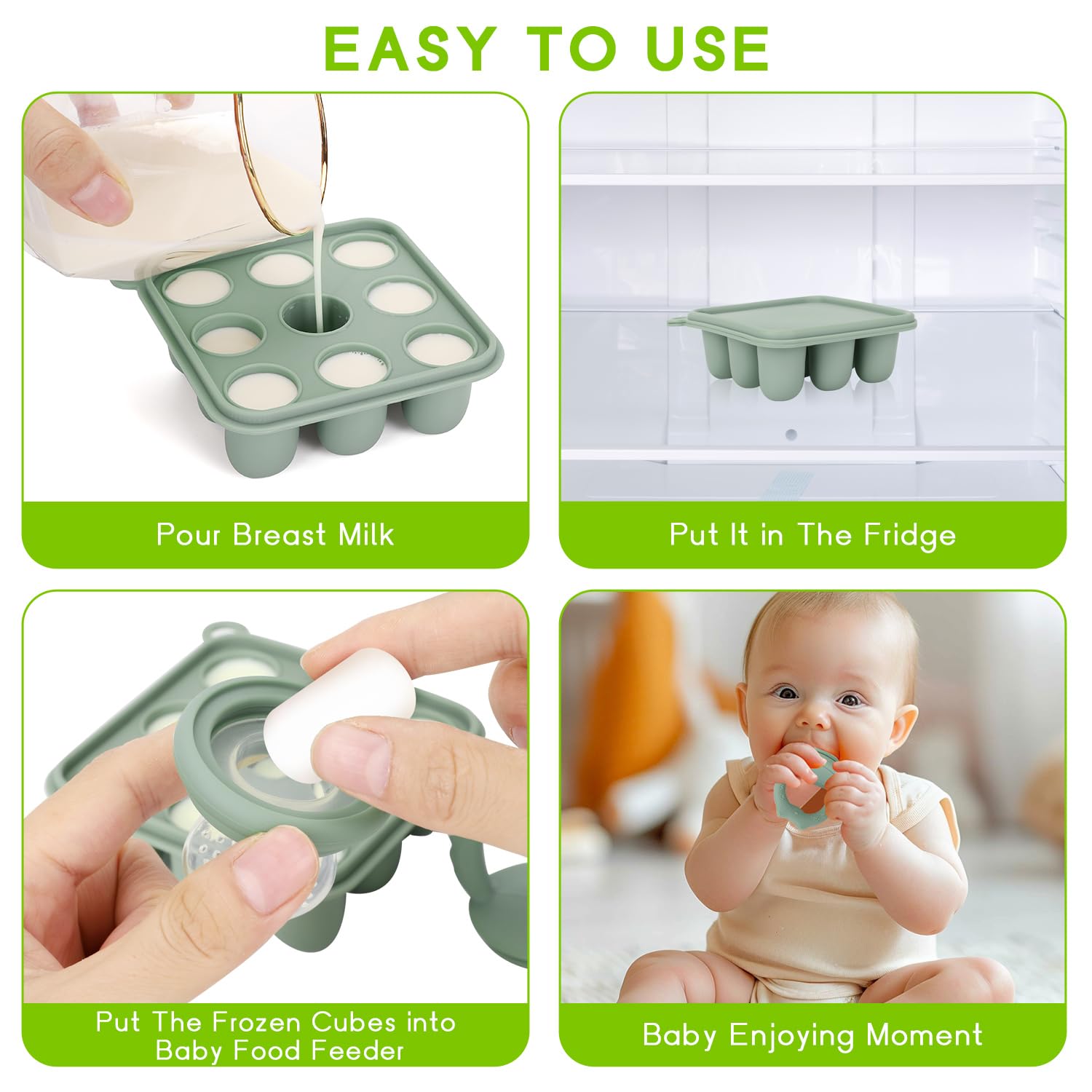 Silicone Food Feeder Set for Infants- Simplify meal prep with our Silicone Baby Food Freezer Tray. Store milk, purees, and smoothies easily with the included lid to ensure freshness and safety for your baby, and also make your freezer mess-free.
