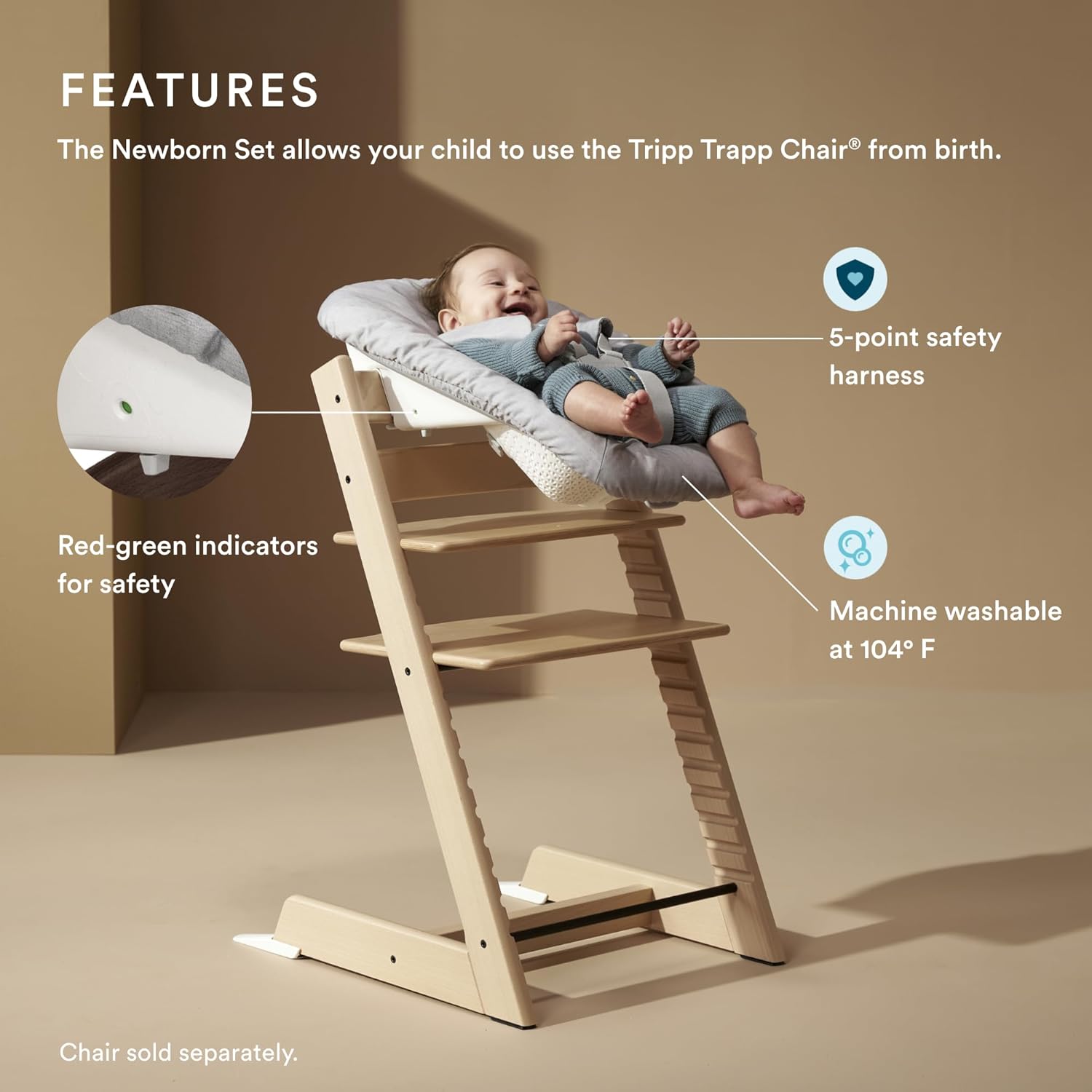 SAFE & SIMPLE – With a tool-free design, Tripp Trapp Newborn Set easily attaches onto Tripp Trapp chair models after May 2003. Red-green indicators reassure you that it’s mounted correctly, while the harness & protective pads keep baby extra secure.