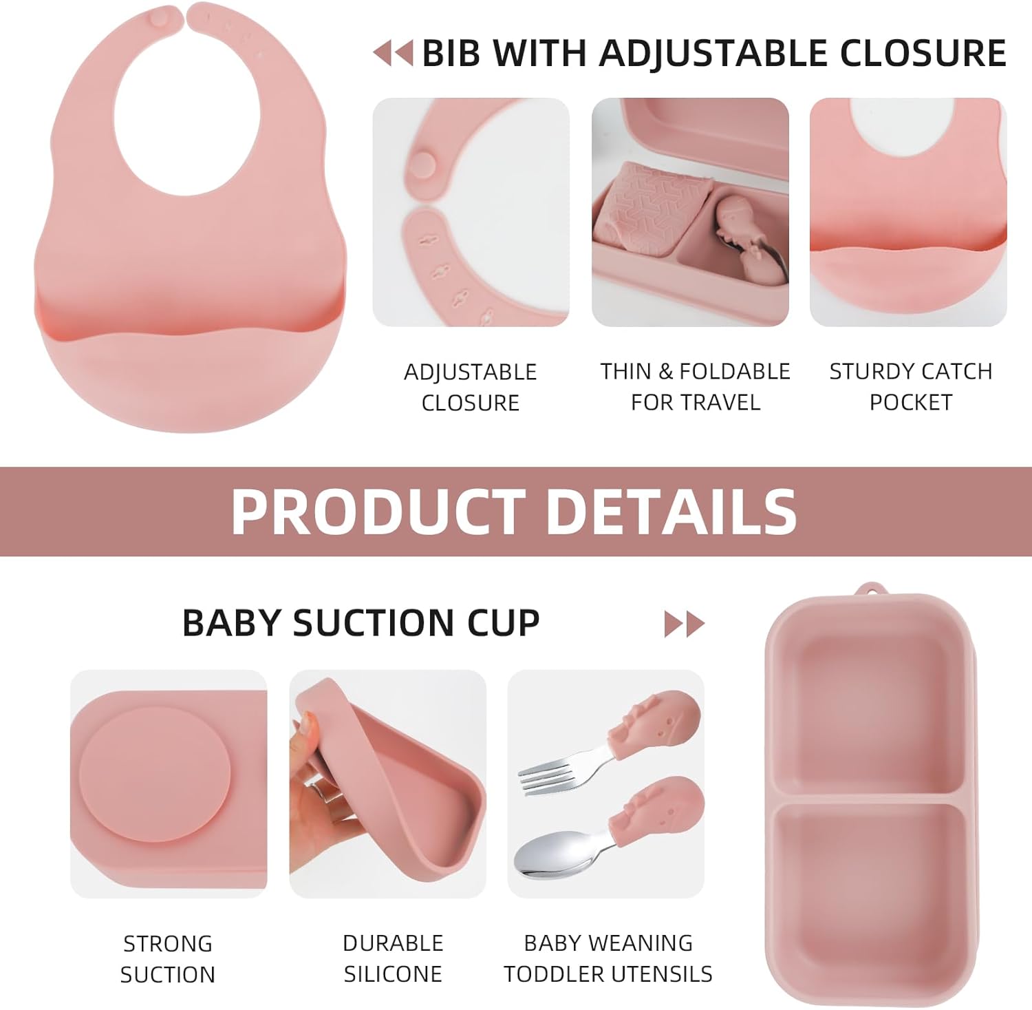 【Superior Safety & Durability】Made with food-grade 316 stainless steel spoons and forks (rust-resistant & easy to clean), paired with soft silicone plates and bibs. BPA-free, non-toxic materials ensure safe feeding for babies 6+ months.