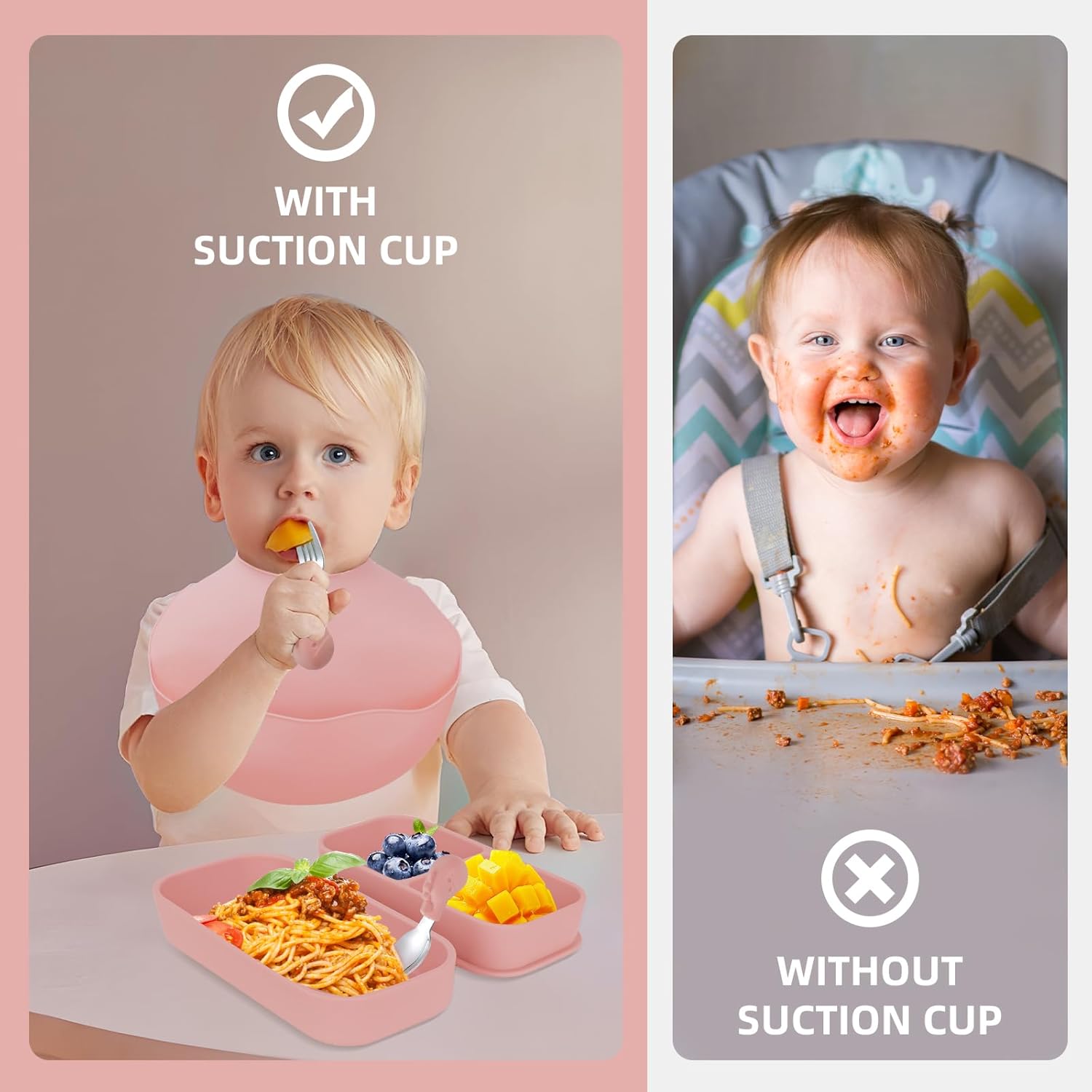 【Strong Suction Base & Anti-Spill Design】Silicone suction plates stick firmly to tables, preventing messy spills. Ideal for active toddlers learning self-feeding.