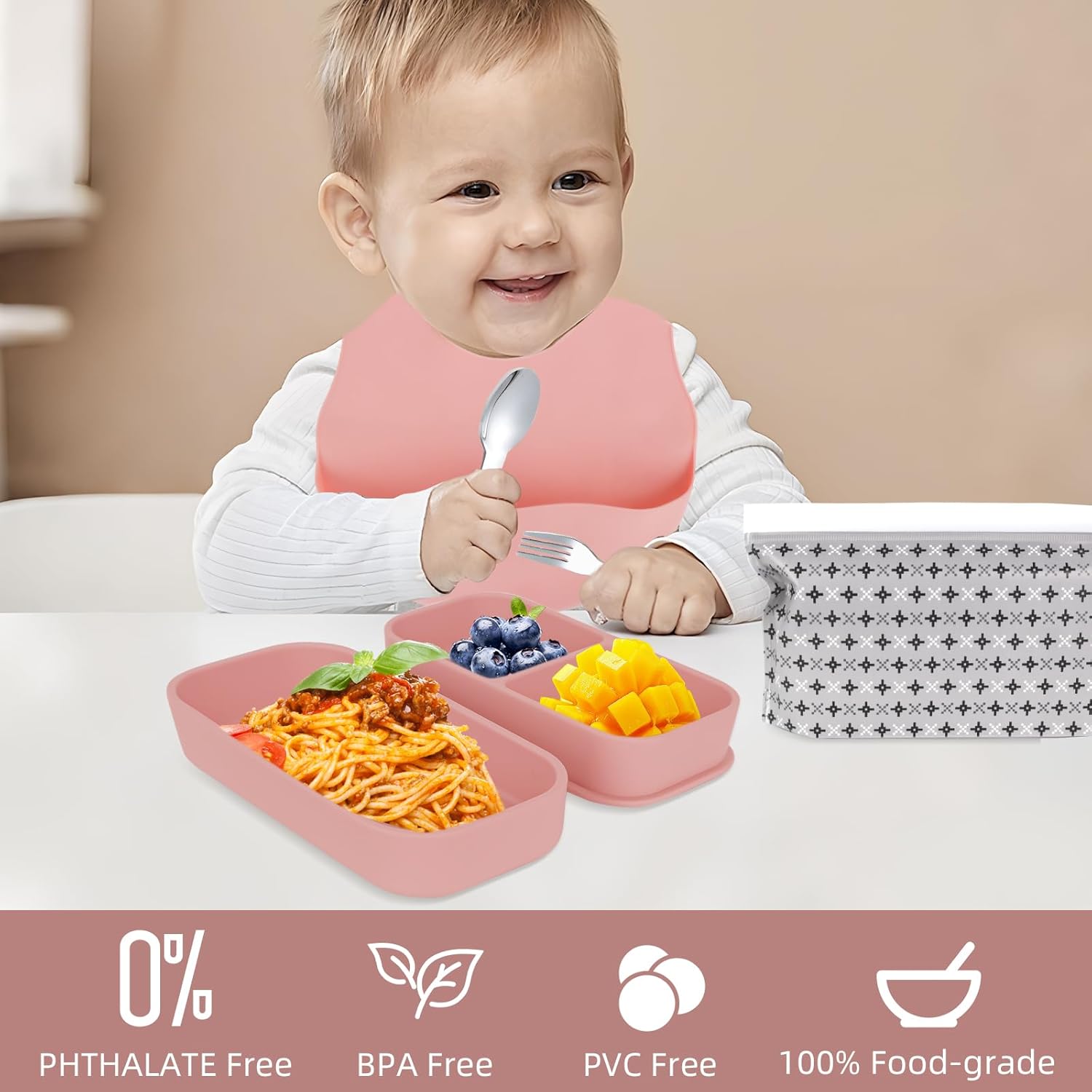 【Superior Safety & Durability】Made with food-grade 316 stainless steel spoons and forks (rust-resistant & easy to clean), paired with soft silicone plates and bibs. BPA-free, non-toxic materials ensure safe feeding for babies 6+ months.