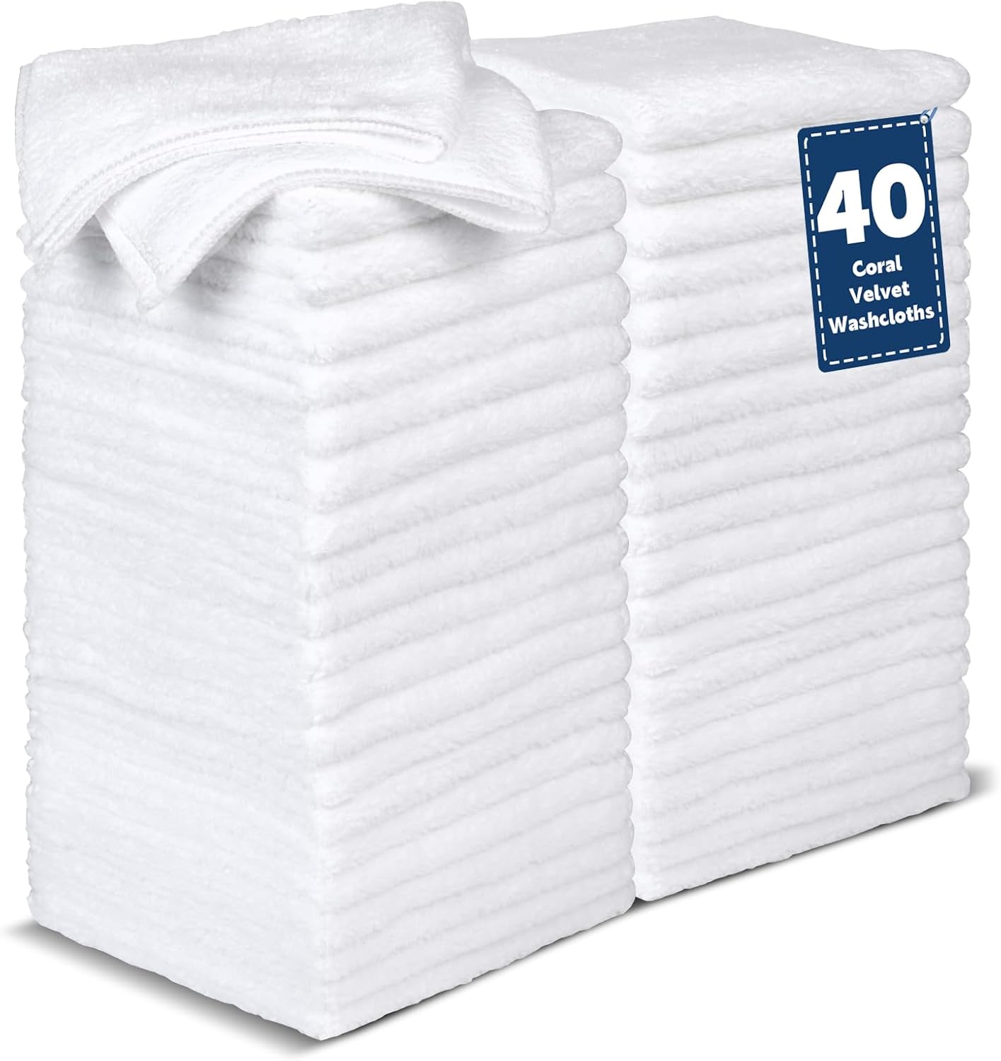 TEAWOO 40 Pack Coral Velvet Washcloths Bulk, Highly Absorbent and Soft Face Towels, Multi-Purpose Wash Cloths & Hand Towels for Bathroom, Hotel, Spa and Gym, 12 x 12 inches