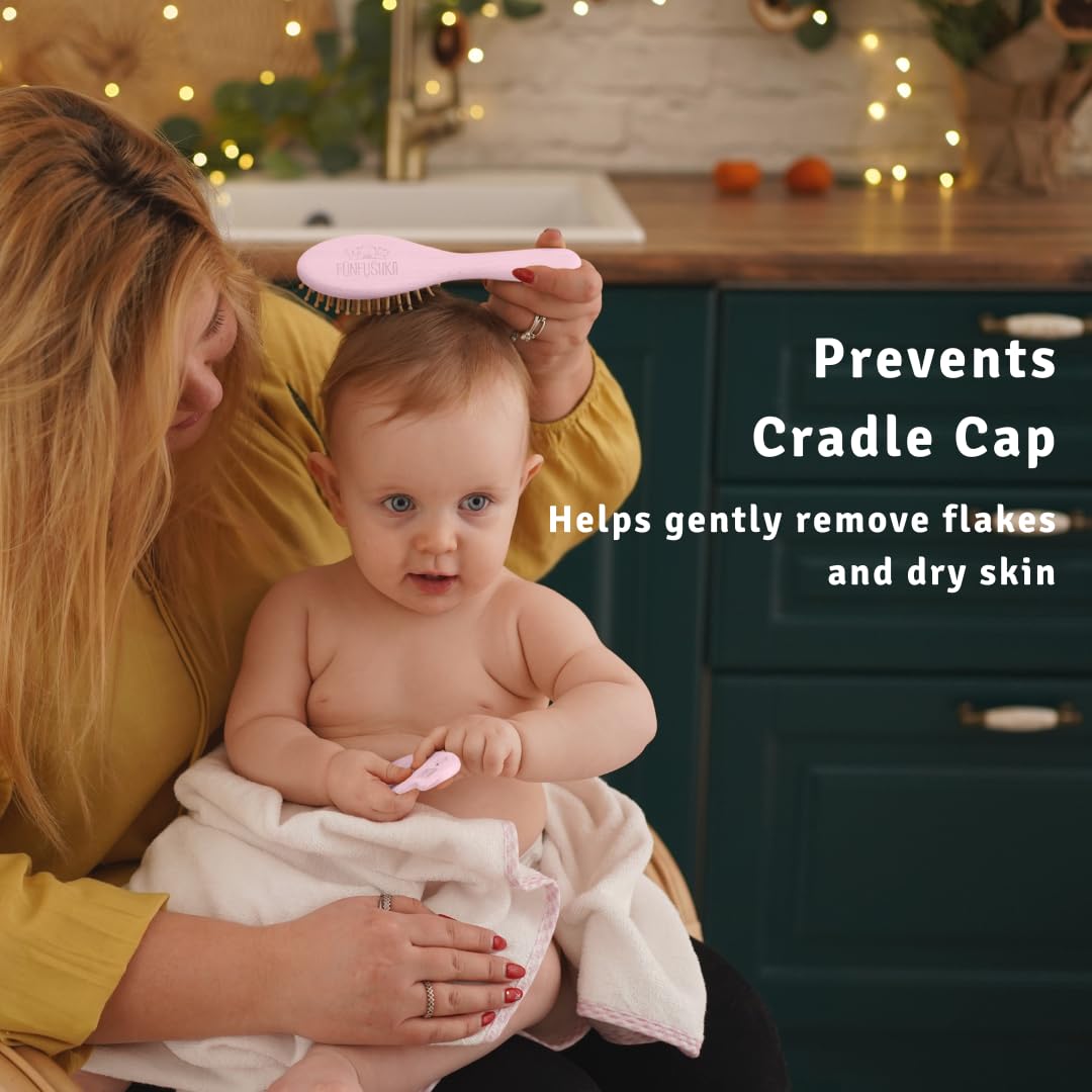 Prevents Cradle Cap – Funfushka’s all natural goat bristle brush provides gentle exfoliation to the baby’s scalp. Regular, gentle brushing can help remove the flakes of the cradle cap without causing discomfort or irritation for your little one.