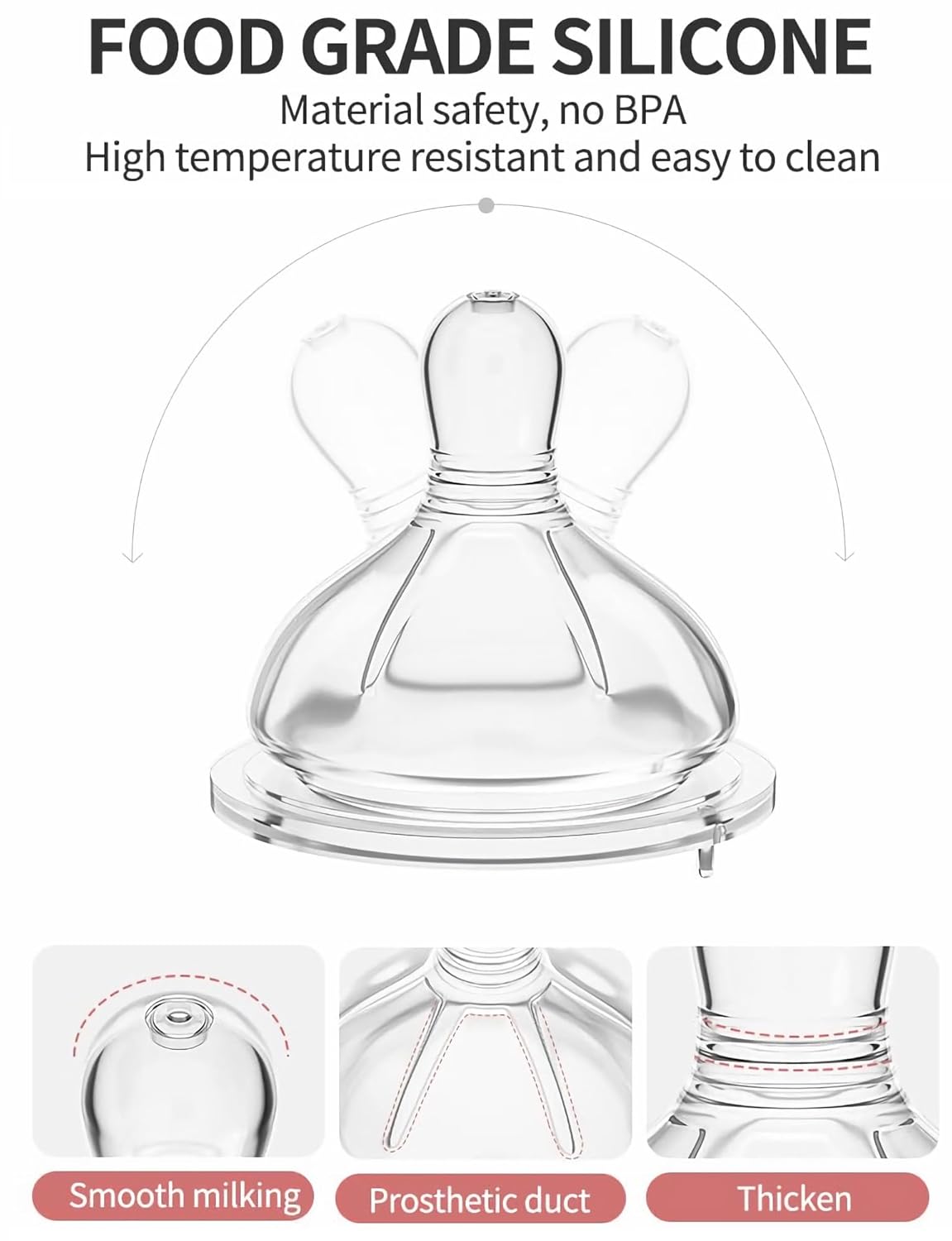 ★Transition from Breast with Breast-Shaped Nipple: With a breast shape, the nipple mimics the shape and feel of a breast to give babies a sense of satisfaction and security to ease the transition from breast to bottle; Made of food-grade silicone, the nipples are made tens of thousands of pulling experiments and can protect baby’s gums well;