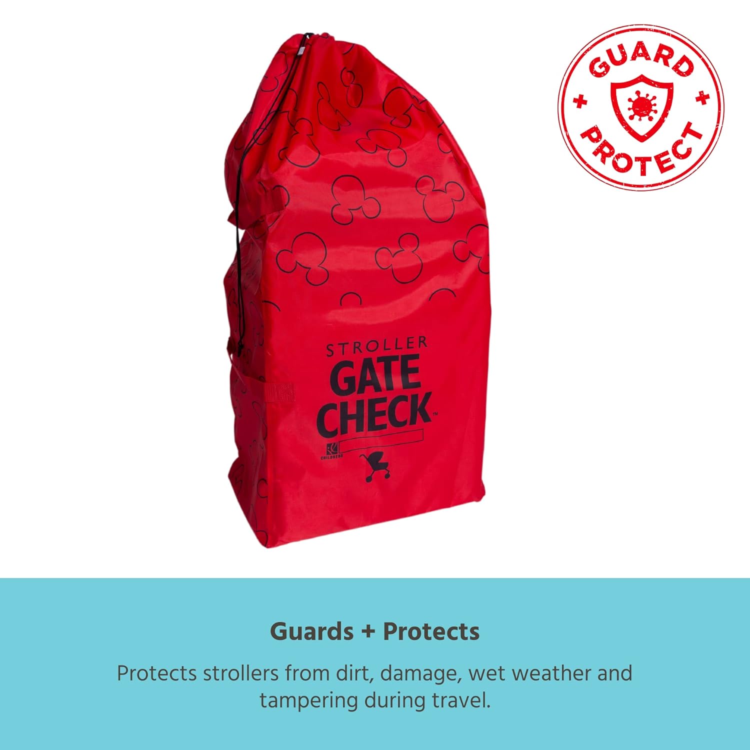 Best-selling J.L. Childress travel bags are now available with a little Disney magic! Stroll down the airport concourse with confidence knowing your stroller will be protected from dirt, grease and more. The bright red Disney Baby by J.L. Childress Gate Check Bag for Standard & Double Strollers has been a go-to travel bag for parents for over a decade…and with good reason. This durable yet lightweight bag fits and easily covers most standard and compact double strollers, and features a drawstring closure with adjustable lock, reinforced seams and dual carry handles. The attached stretch pouch makes unfolding and refolding the bag quick and easy. The big white ID box for your name helps quickly identify your stroller. The durable fabric and large GATE CHECK logo help ensure that your stroller is protected and safely returned to you at the end of your flight. It’s also the perfect bag to use for storage when your stroller isn’t in use. You pack the snacks, we’ve got the stroller covered. AIRLINE APPROVED and recommended by baggage handlers around the world.