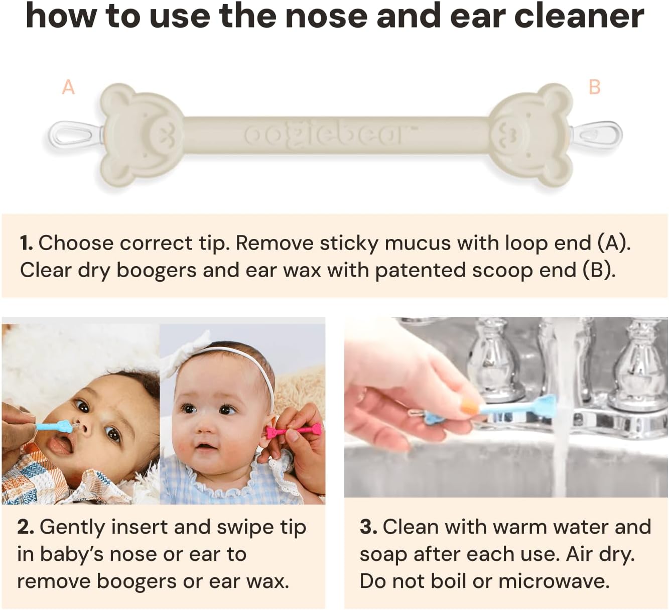The booger and ear wax picker has a patented scoop tip to clear dry boogers and ear wax. Its loop end removes sticky mucus. Soft yet structured rubber tips are engineered to be comfortable (and still effective). The adorable bear-head safety bumper prevents the tool from going too far into tiny noses and ears.