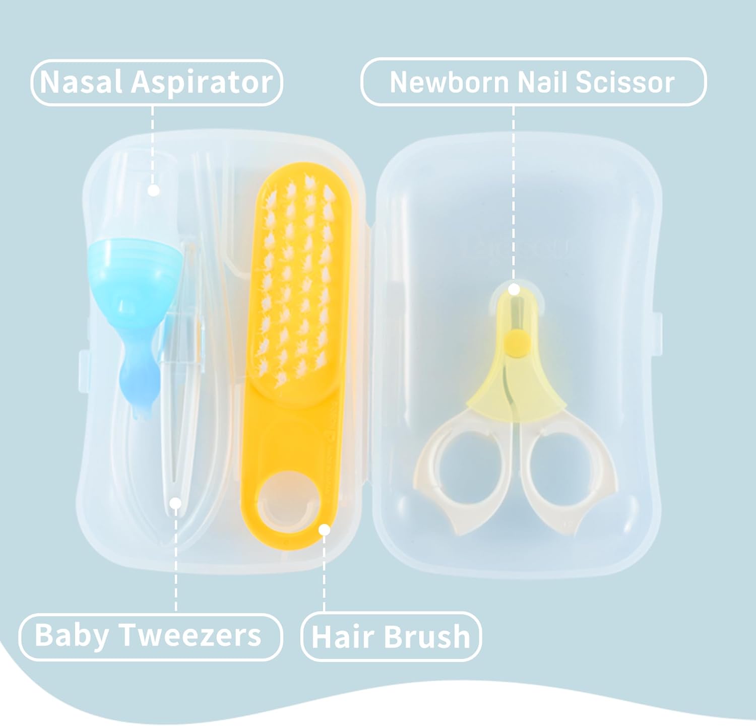 COMPLETE GROOMING SET: This comprehensive 4-in-1 baby grooming kit features essential tools for your baby’s care, including newborn nail scissors, a gentle brush, a baby tweezer, and a nasal aspirator. It comes with a convenient storage case, making it perfect for both home and travel use.