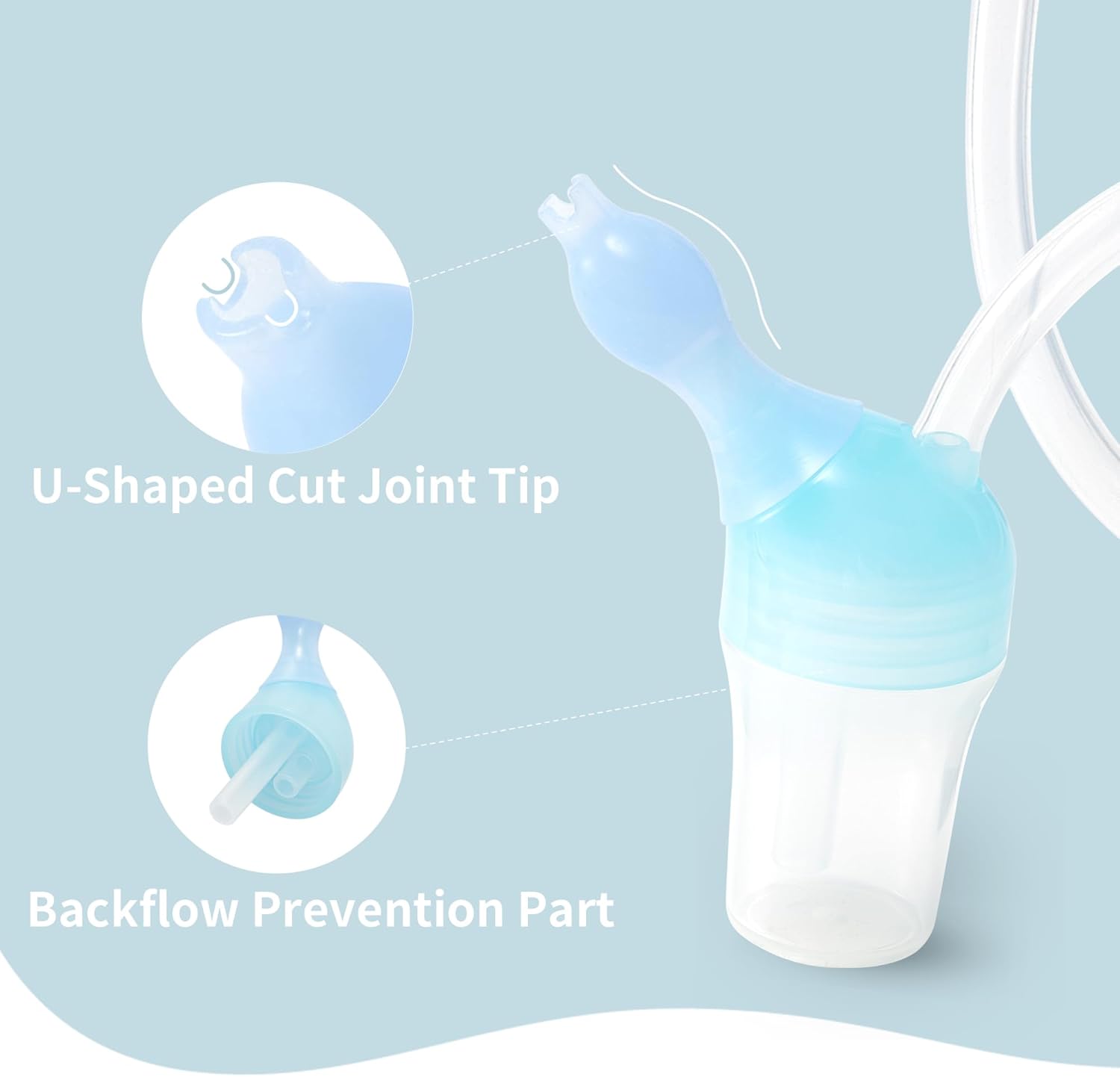 NASAL SUCKER CLEAR NOSE: Nose-cleanser with tube type, the uniquely designed U-shaped tip of the nasal aspirator efficiently suctions without causing discomfort. Equipped with backflow prevention components and an adjustable suction tube, it provides effective and safe relief for your baby’s blocked nose.