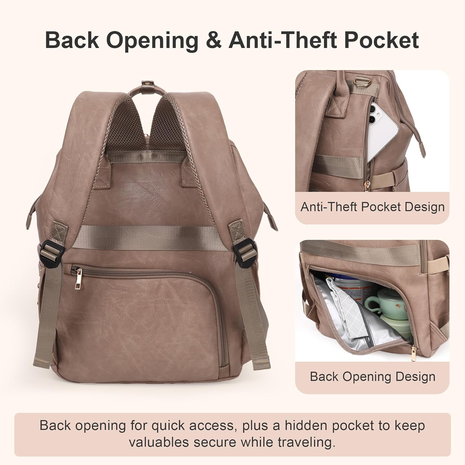Spacious Capacity & Smart Organization – Crafted from premium leather, this spacious 30L diaper backpack (16.73” × 7.87” × 13.98”) is designed with 16 compartments, including 3 insulated bottle holders (fits 3–11 oz), a dry/wet pocket, and quick-access pockets for your phone and keys. The wide-open top design allows you to easily load and retrieve all your baby essentials, keeping outings stress-free and well-organized at all times.