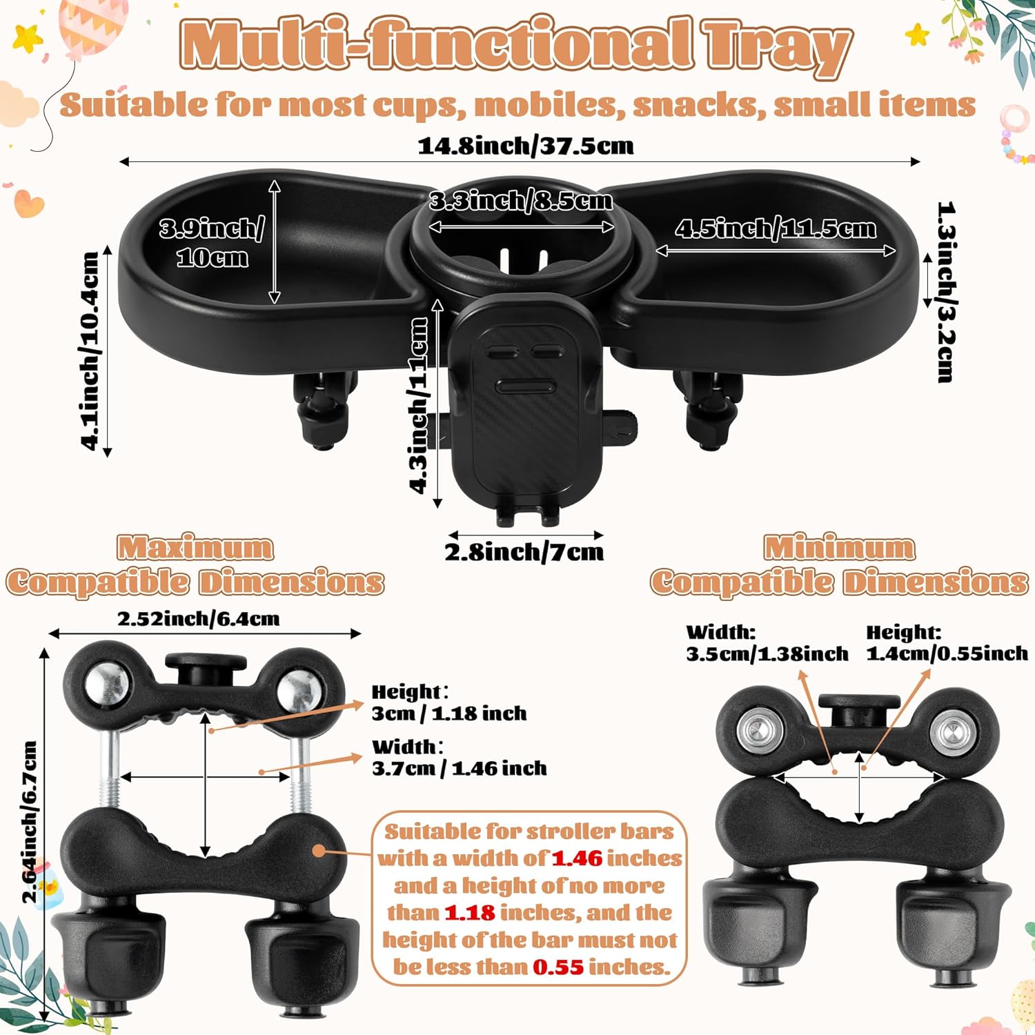 Versatile Compatibility & Easy to Set Up:The two trays are adjustable in angle, you just need to adjust them to the right angle, no extra tools are needed, just fix the clips on the stroller crossbar and rotate the clips to finish the installation or removal. (Please make sure the handle diameter of your stroller bar is within a width of 1.46 inches and a height of no more than 1.18 inches.)