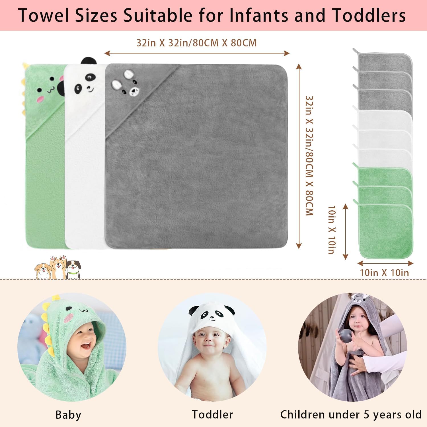 Cute Designs to Make Bath Time Fun: The hooded baby bath towel comes in a variety of fun patterns, including green dinosaur, gray bear, and white panda. Each color is paired with three washcloths, making bath time more enjoyable and cozy. The hood helps keep your baby warm and dry, making them love bath time.