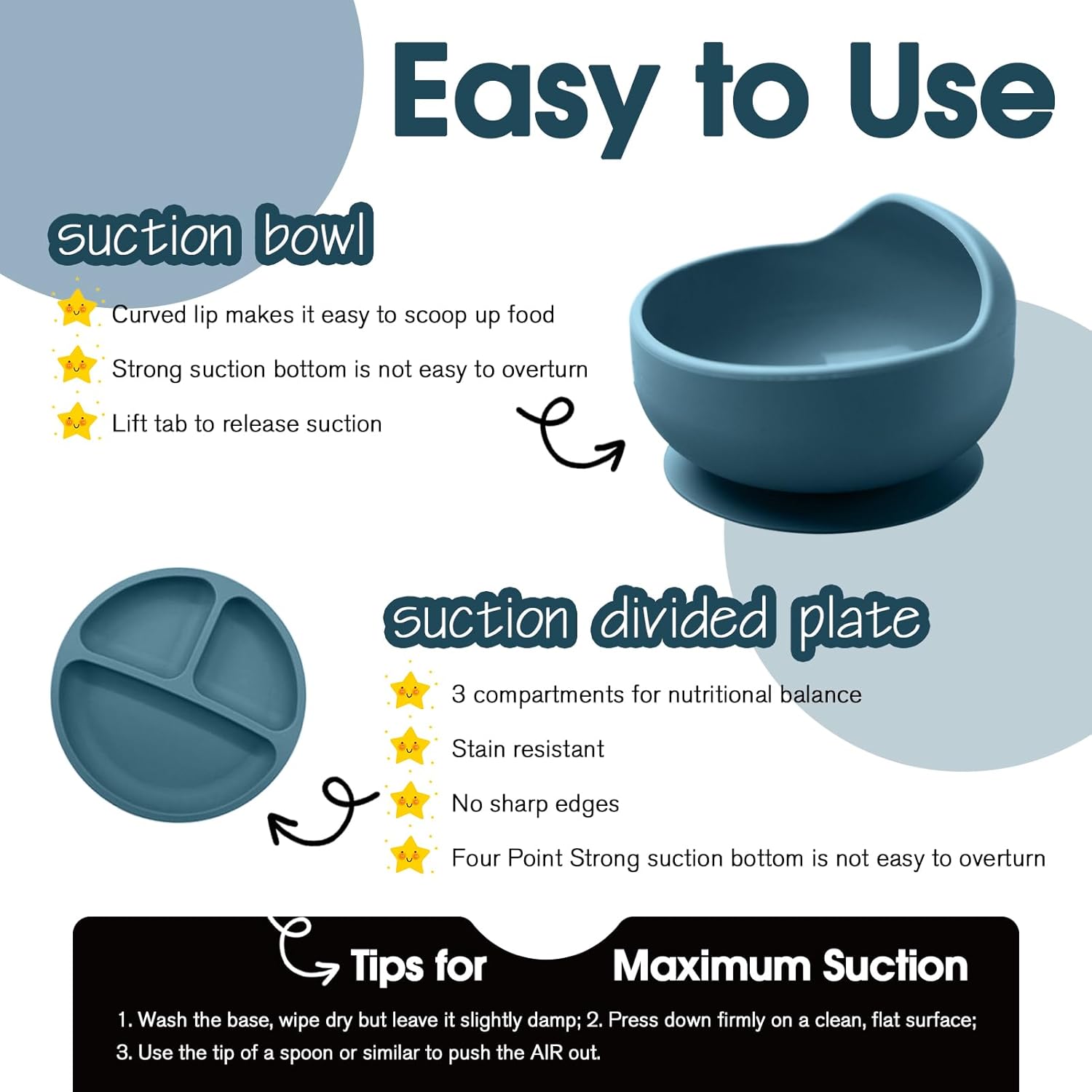 Strong Suction Base: Our baby plates and bowls have a strong suction base that sticks securely to smooth surfaces, preventing your baby from pulling them off. The divided plate design keeps different foods separate so your baby can learn to feed himself without worrying about making a mess on the floor or dropping plates and bowls.