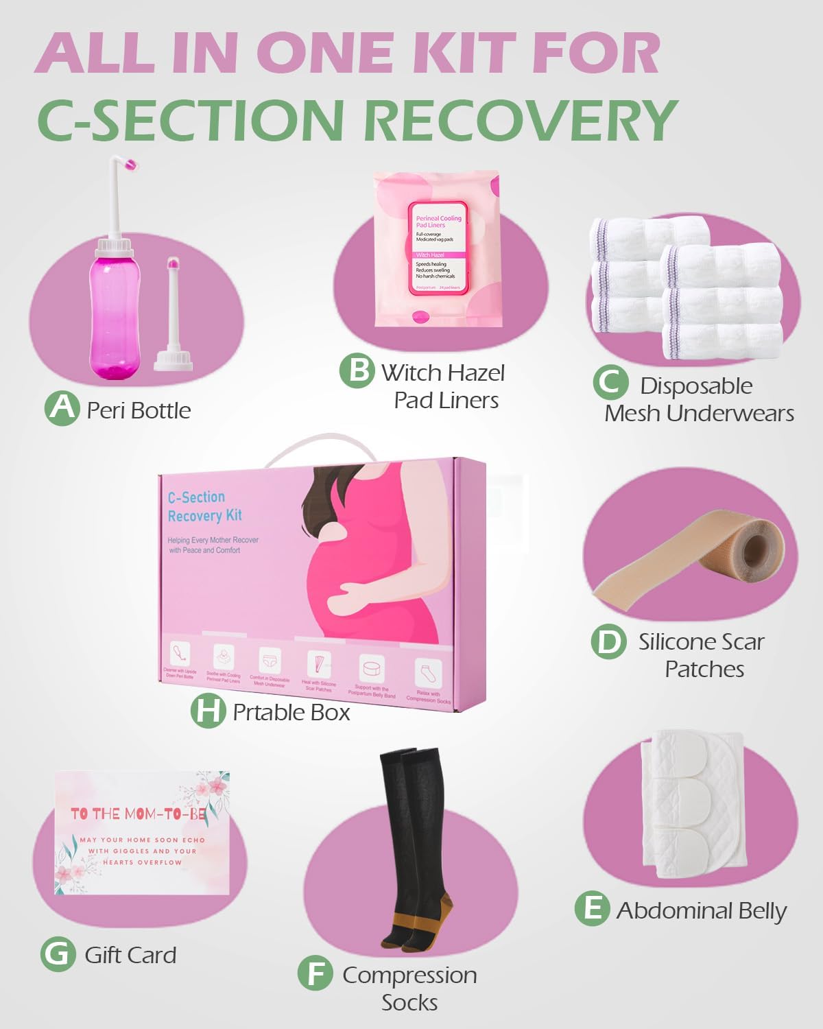 【EVERYTHING IN ONE KIT】The c section recovery kit includes: ✔️Premium Angled Peri Bottle (1)✔️Super-Soft Mesh Underwear (6 ps)✔️Cooling Witch Hazel Pads (24 ps)✔️Silicone Scar Sheets (1)✔️Adjustable Belly Binder✔️Compression Socks✔️Card(1).