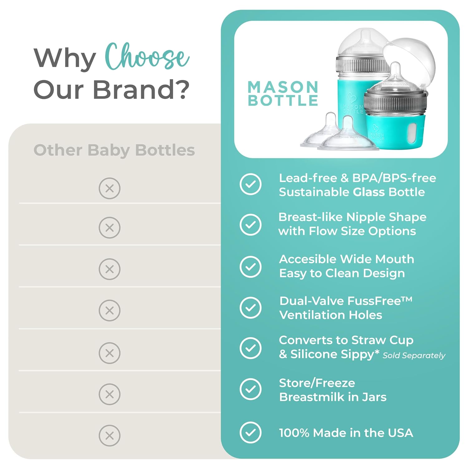 Complete Set Included: The Essential 2-Pack Gift Set includes a total of 10 items: 1x 8oz Mason Bottle, 1x 4oz Mason Bottle, 2x slow flow nipples (for 0-3 months), 2x medium flow nipples (for 3-6 months), 2x caps+rings, 1x 4oz silicone sleeve, and 1x 8oz silicone sleeve. Perfect for parents looking for glass baby bottles for breastfed babies.