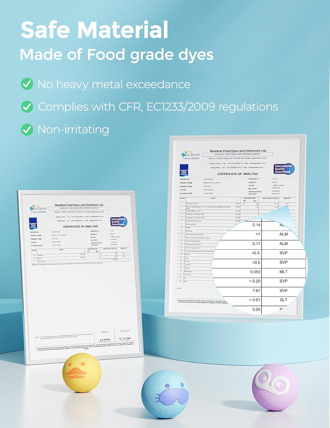 【Richer Bubbles for Extra Fun in the Bath】Our kids’bath bombs are designed to produce richer and longer-lasting bubbles, ensuring a more enjoyable bath time experience. Watch as your child is surrounded by soft, frothy bubbles, making bath time fun and relaxing for toddlers and kids alike.