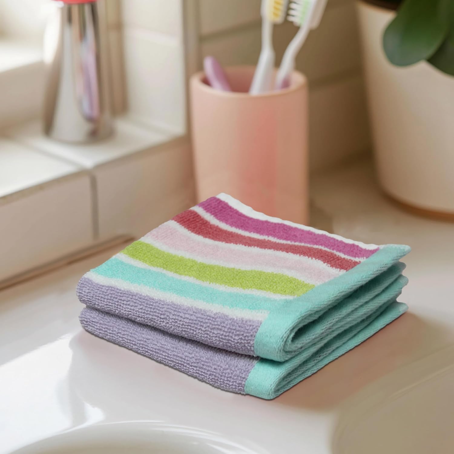 Kid-Friendly Stripes: Add a splash of fun to bath time with these classic pink multicolored stripe wash cloths — perfectly sized and styled for babies, toddlers, and young kids.