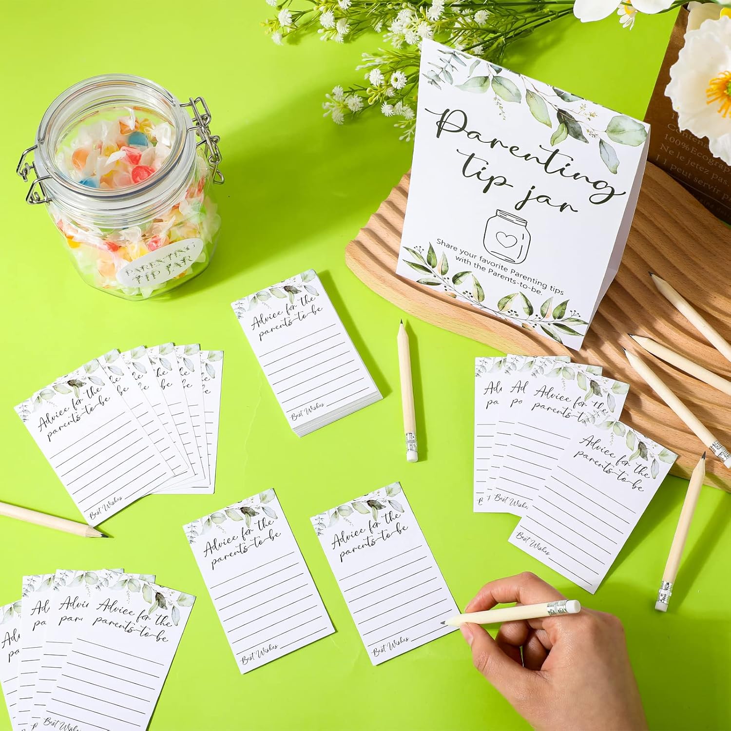 Customers find the parenting advice cards cute and appreciate them as an activity for baby showers, with one mentioning how guests can participate without pressure. The product receives positive feedback for its quality and decor, with one customer noting how it blends nicely into the decor. However, the jar is made of plastic rather than glass, and customers find it smaller than expected. Moreover, the functionality receives mixed reviews, with several customers reporting issues with the pencils not working well with the cards, and opinions on value are divided between those who find it cheap and those who consider it good value.