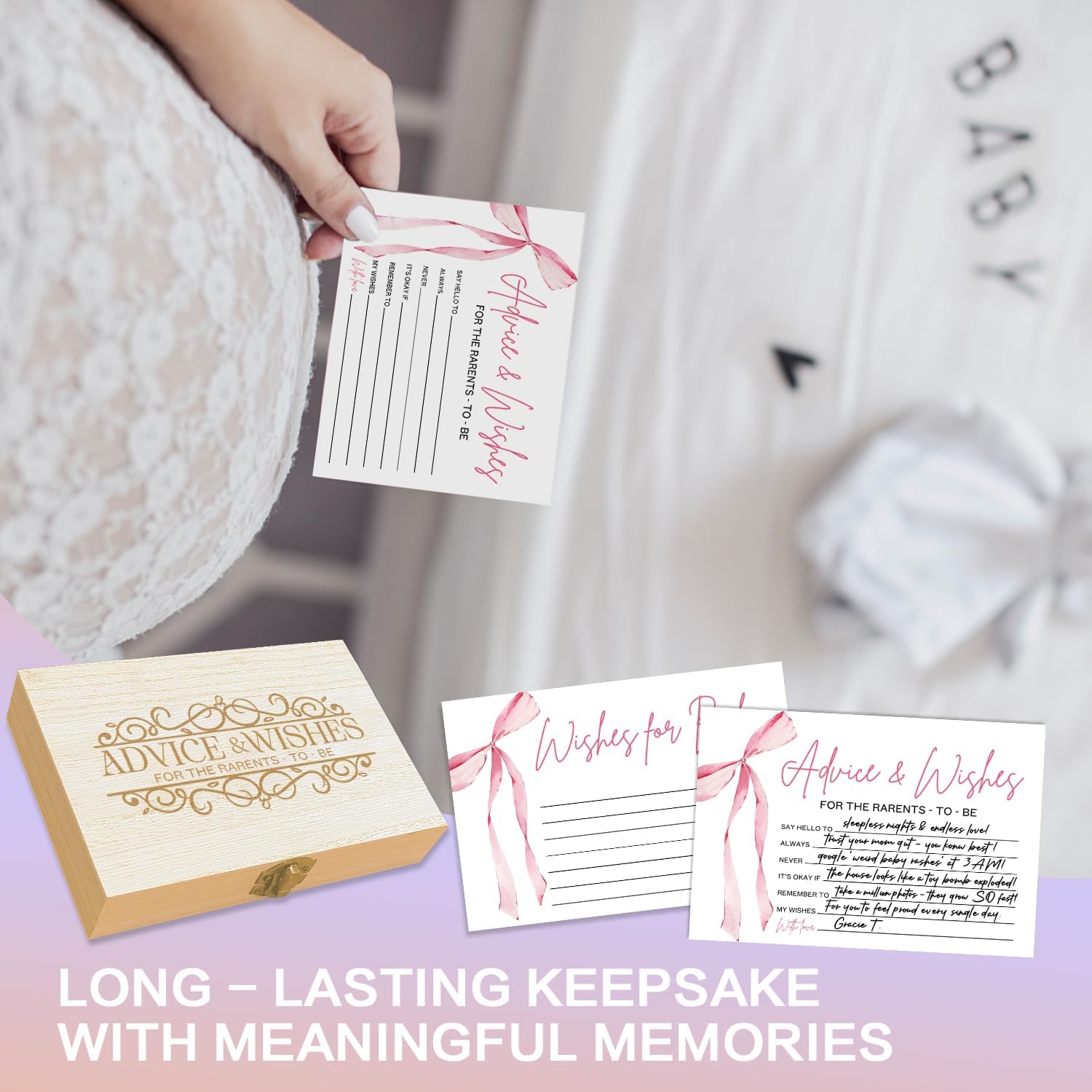 Set Includes: A baby advice and wishes box, 50 double-sided baby shower game cards with parenting advice, adorable baby shower decorations, and heartfelt wish cards to capture special messages. These versatile cards double as charming baby shower table decorations!