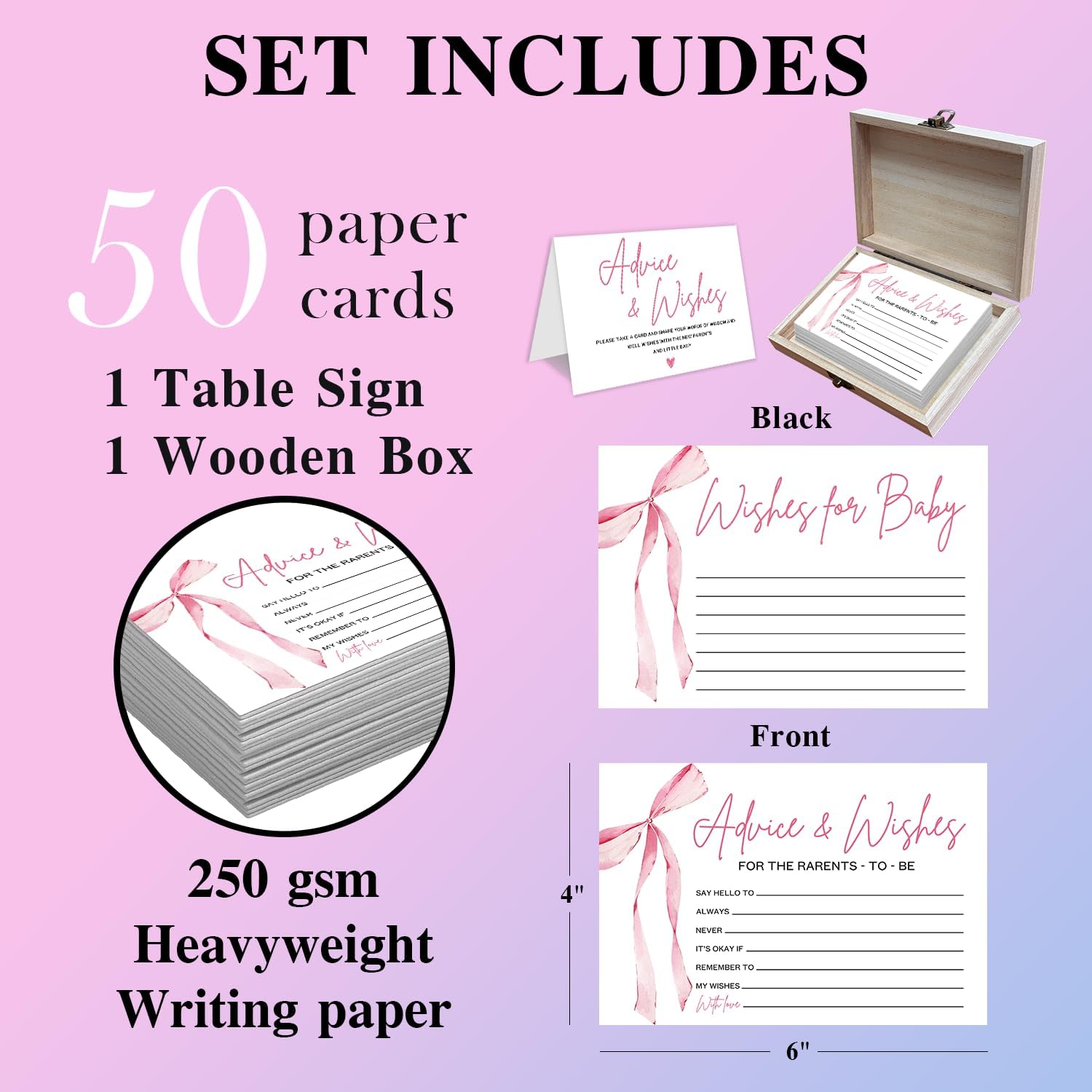 Advice and Wishes Cards with Box For Parents To Be – 50 Pcs Pink Bow Advice Cards, Baby Shower Paty Game, Well Wishes Box for New Parents Baby Shower Decorations -A05