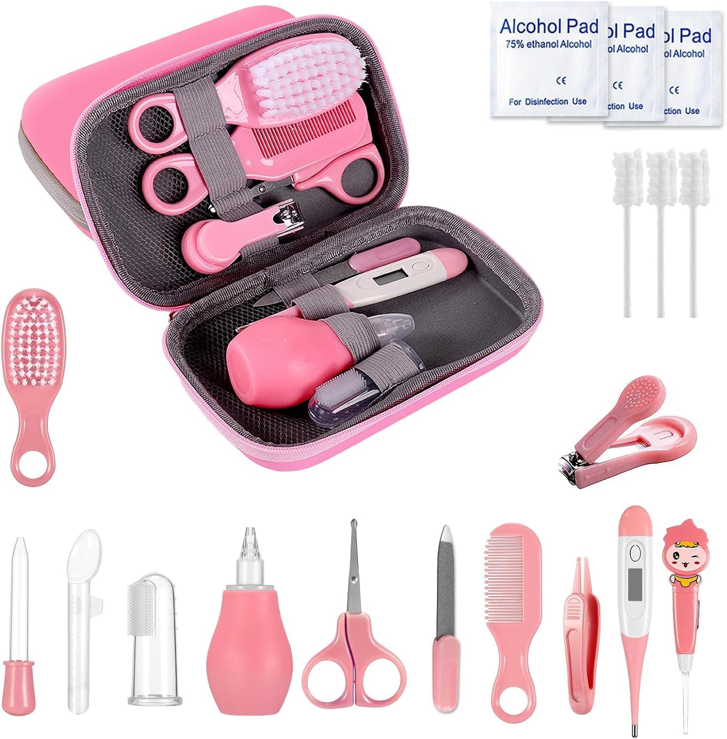 👼【Upgraded Fully Equipped Baby Care Kit】This 19pcs baby healthcare kit includes baby nail clippers and files, baby scissors, nasal aspirator, hairbrush, comb, feeder and dropper, tweezers, finger toothbrush, digital temperature device, 3 alcohol pads, 3 oral hygiene sticks, ear cleaners and cute portable luggage, fully meet your baby’s daily needs, perfect baby supplies for newborns!
