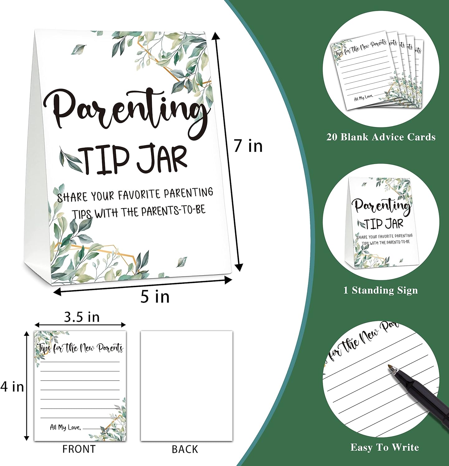 Baby Shower Game Set, Parenting Tip Jar Party Games(1 Standing Sign + 20 Advice Cards), Greenery Blank Advice Cards for New Parents, Eucalyptus Baby Shower/Gender Reveal Party Favor Decor(A01)