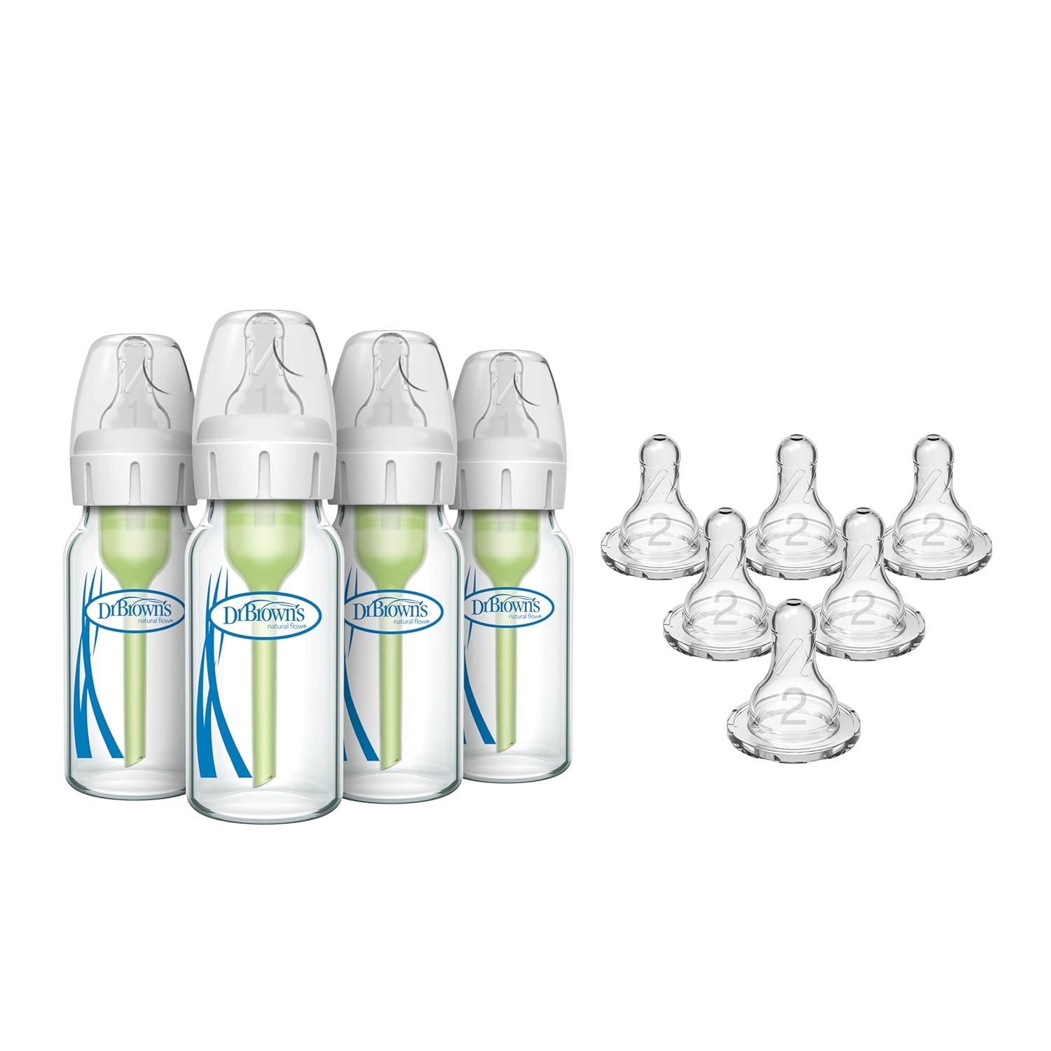 The Dr. Brown’s Anti-Colic Narrow Glass Bottle and Level 2 Nipple Bundle is designed to support your baby’s feeding journey from newborn stage and beyond. This bundle includes four 4 oz/120 mL Dr. Brown’s Natural Flow® Anti-Colic Options+™ Narrow Glass Baby Bottles with Level 1 Slow Flow Nipples and a 6-count pack of Dr. Brown’s® Level 2 Medium Flow Narrow Silicone Nipples, perfect for babies 3 months and older. Both the bottles and nipples feature Dr. Brown’s clinically proven anti-colic internal vent system, which reduces colic, spit-up, burping, and gas for a more comfortable feeding experience. Vacuum-free feeding closely mimics breastfeeding, and the soft, breast-like silicone nipples encourage a proper latch and natural bottle-feeding experience, making transitions between breast and bottle easier. As your baby grows, seamlessly move to the Level 2 Medium Flow Nipples for a consistent, faster flow at baby’s own pace. The heat and thermal shock-resistant glass bottles withstand hot and cold temperatures and gradual temperature changes. Both bottles and nipples help preserve nutrients in breast milk and formula, aiding digestion and promoting better sleep. Made with 100% silicone, the Level 2 Nipples fit all Dr. Brown’s narrow bottles. All components are dishwasher (top rack), sterilizer, and boil safe, and BPA free. This bundle provides a reliable, trusted feeding solution from the #1 Pediatrician Recommended Baby Bottle in the U.S.* *IQVIA Health ProVoice Survey 2024
