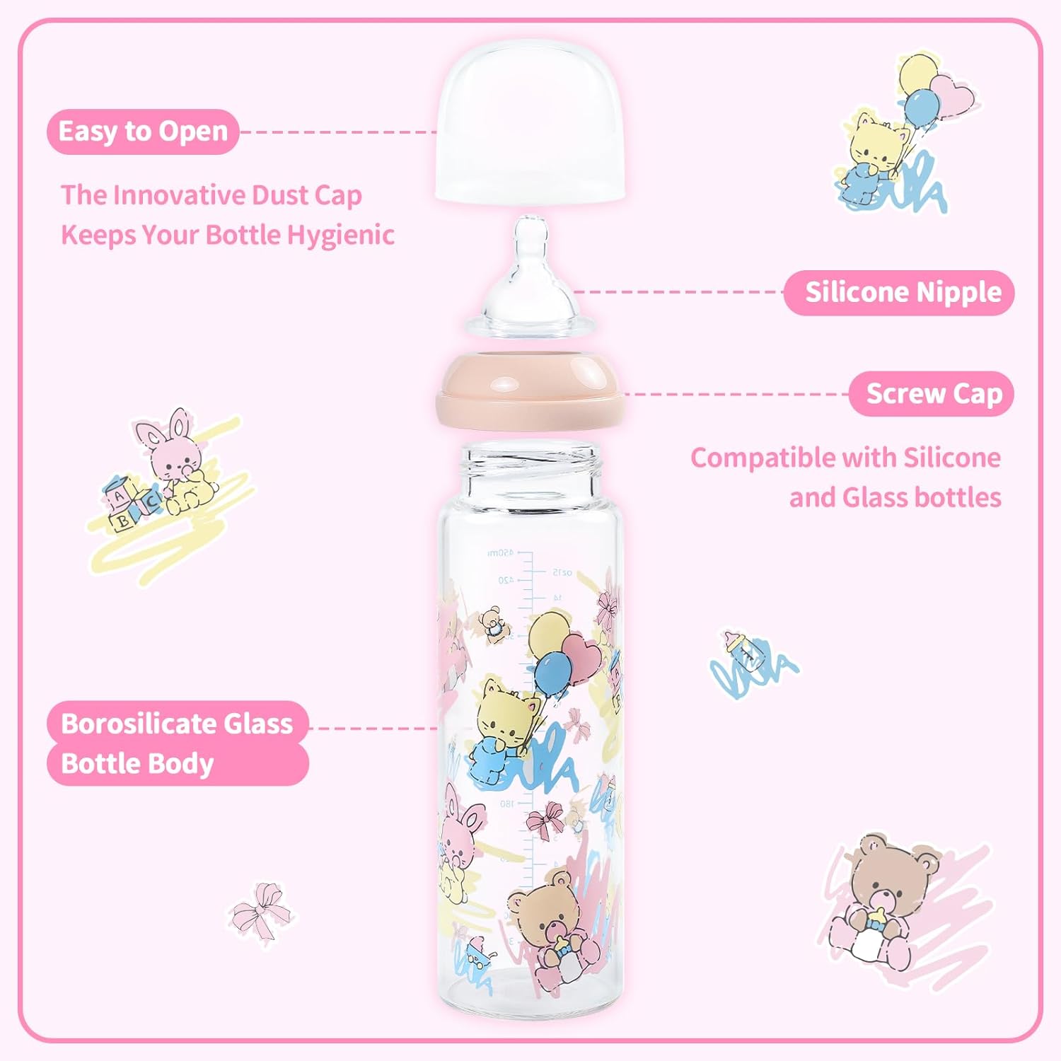 Premium Quality Material: Enjoy the safety and purity of our all-glass, BPA-Free bottle, designed for long-lasting use and a premium feeding experience. The smooth, ergonomic shape fits comfortably in your hands, while the fast-flow nipple delivers an optimal, comforting sip every time. It’s not just a bottle – it’s a perfect blend of charm and functionality.