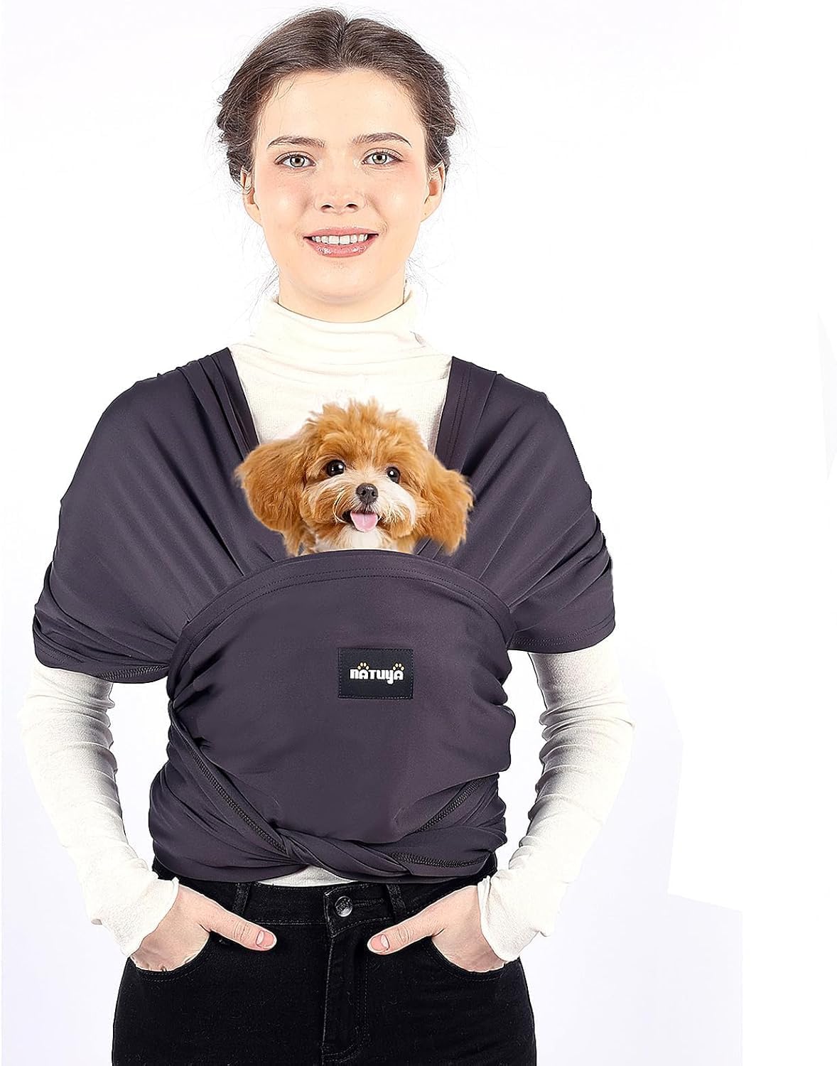 ADJUSTABLE SIZE TO FIT ALL: The Natuya Dog Front Sling Carrier for cats and 5-10 lbs small dogs, such as Pomeranian, Poodle, Chihuahua, Maltese, etc.. Features an adjustable ring that accommodates different sizes, ensuring a perfect fit for everyone in the family. This flexibility means you can easily adjust the sling as your pet grows or as different family members take turns carrying them.