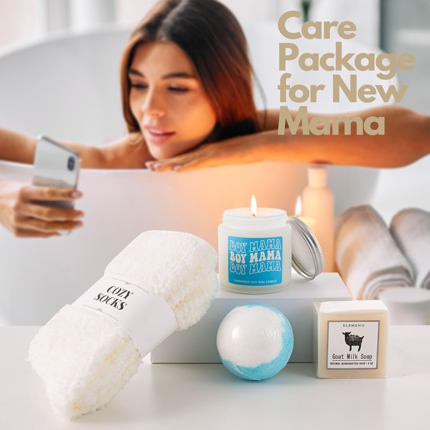 【Pampering Care Package for New Moms】Motherhood is a beautiful journey, but it can also be tiring. This gift set is designed to help new moms relax and recharge. Light the calming lavender candle, enjoy a spa moment with goat milk soap and a fizzy bath bomb, and cozy up with fluffy socks. Pair it with a refreshing drink in the ‘In My Boy Mom Era’ glass for the ultimate self-care routine. A thoughtful way to show new moms they deserve a moment of rest and joy.