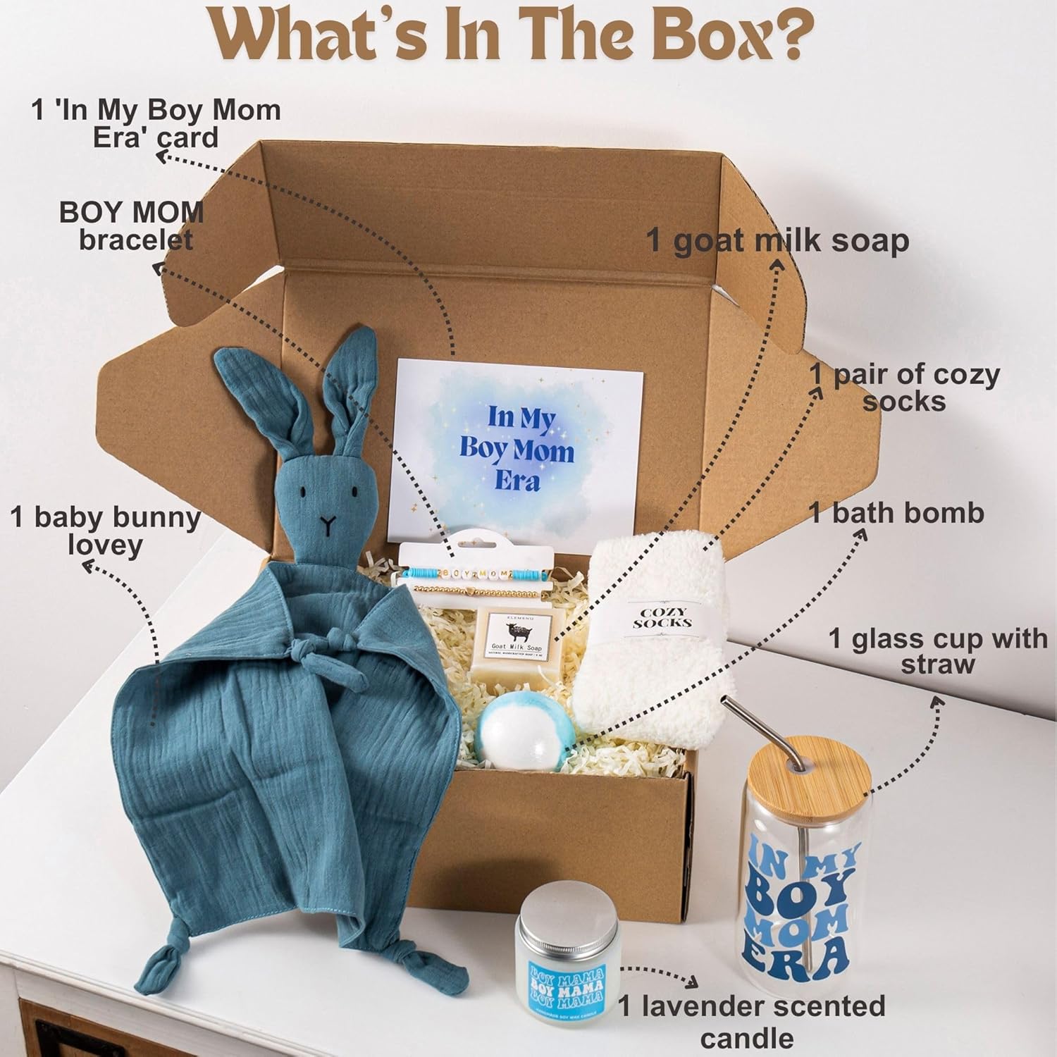 【Everything She Needs to Feel Loved】This charming gift box includes a ‘In My Boy Mom Era’ coffee glass, a 100% soy wax lavender-scented candle, a goat milk soap, a bath bomb, a pair of cozy socks, a baby bunny lovey made from 100% cotton, a ‘BOY MOM’ clay bracelet set, and an ‘In My Boy Mom Era’ card. All items are beautifully packaged in a gift box with raffia filler, making it a delightful surprise for any new mom.