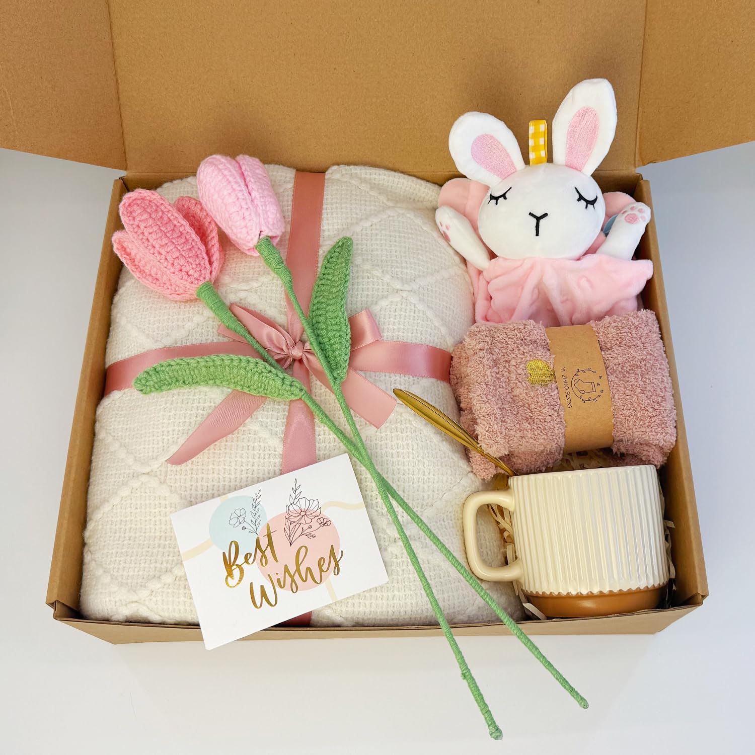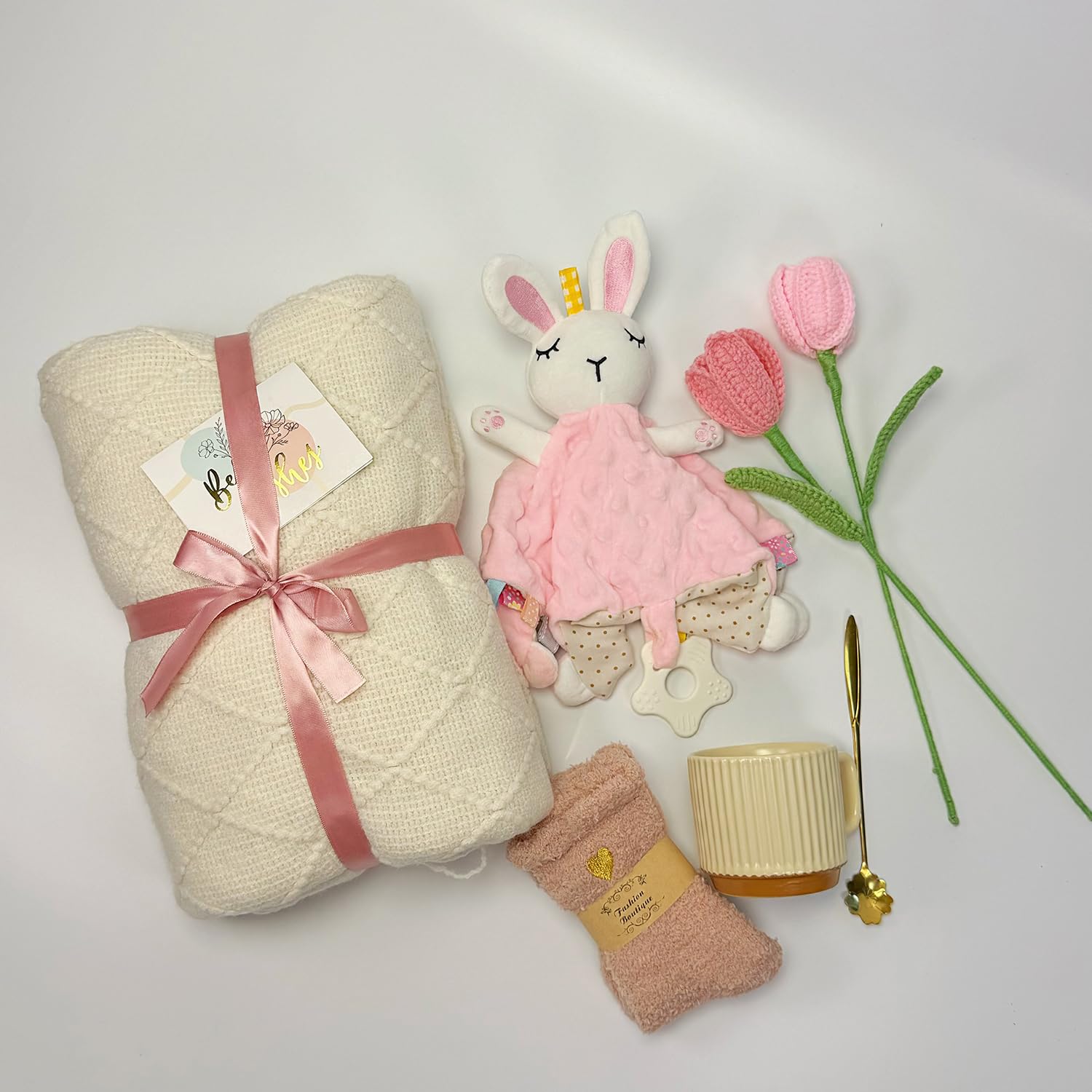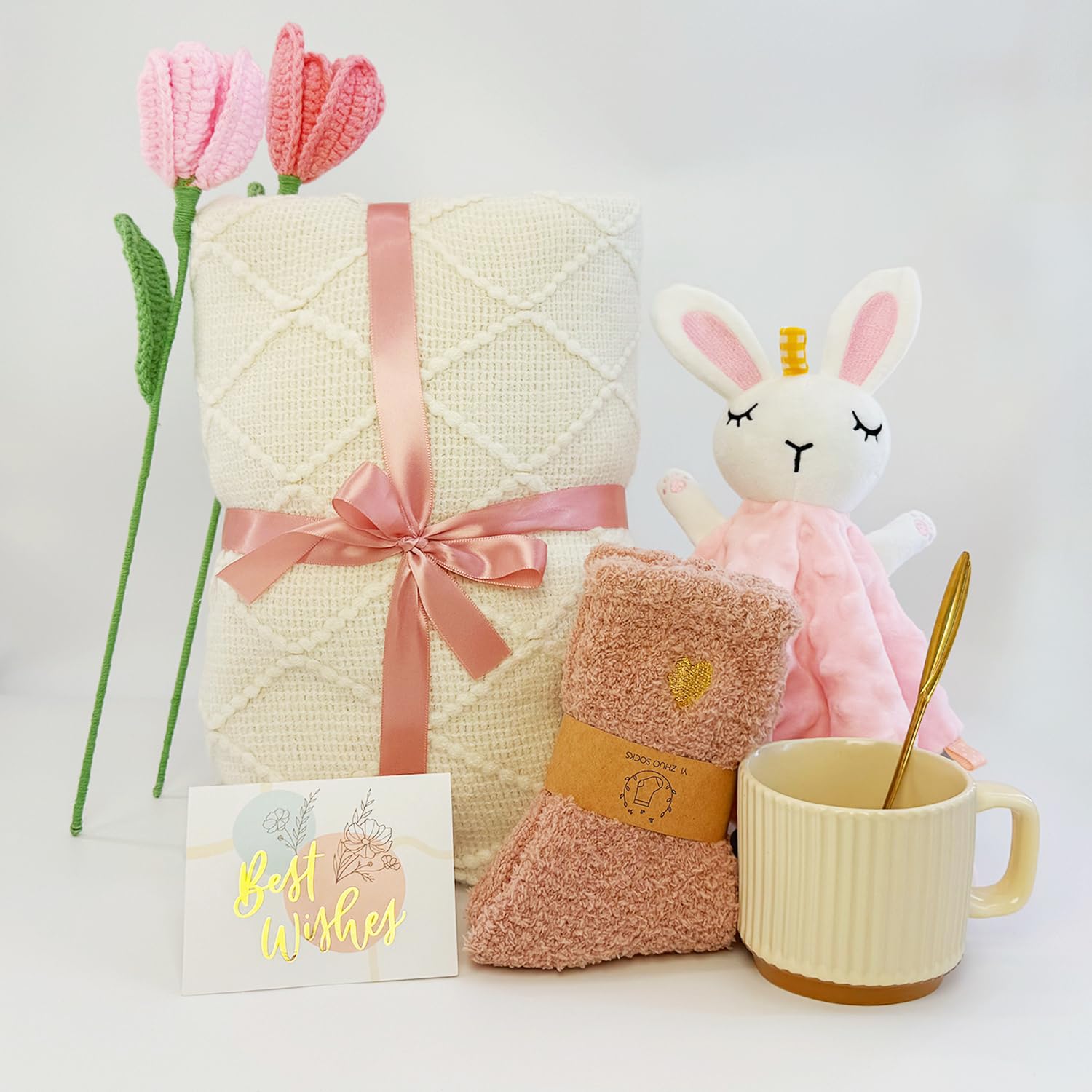 METICULOUSLY PAIRED NEW MOM GIFT BASKET – This carefully curated care package for new mamas is filled with items she’ll cherish and actually use.It includes 1* Snuggly knitted tassel blanket ,1* Bunny lovey for Baby,1* Warm beige mug, 1* Pair of cozy socks for mom, 2* Two handcrafted pink tulip flowers.Wrap her in cherished love with this thoughtfully curated new mom gift basket