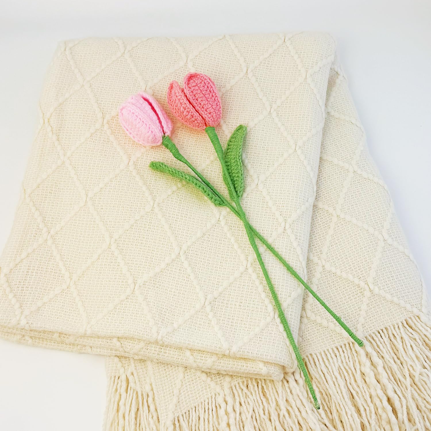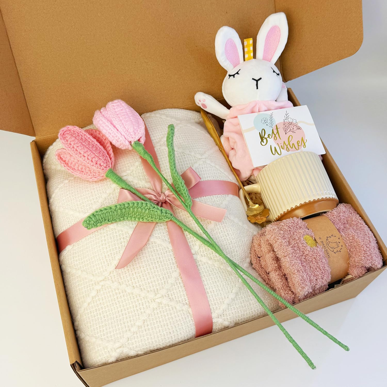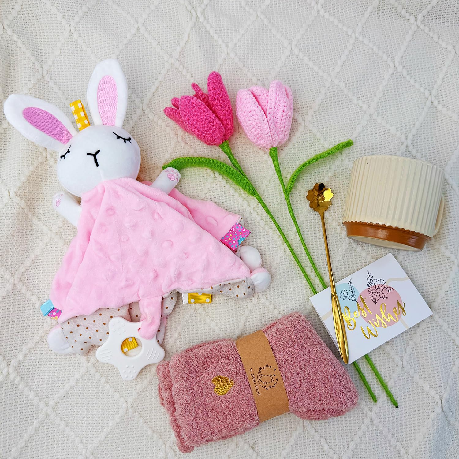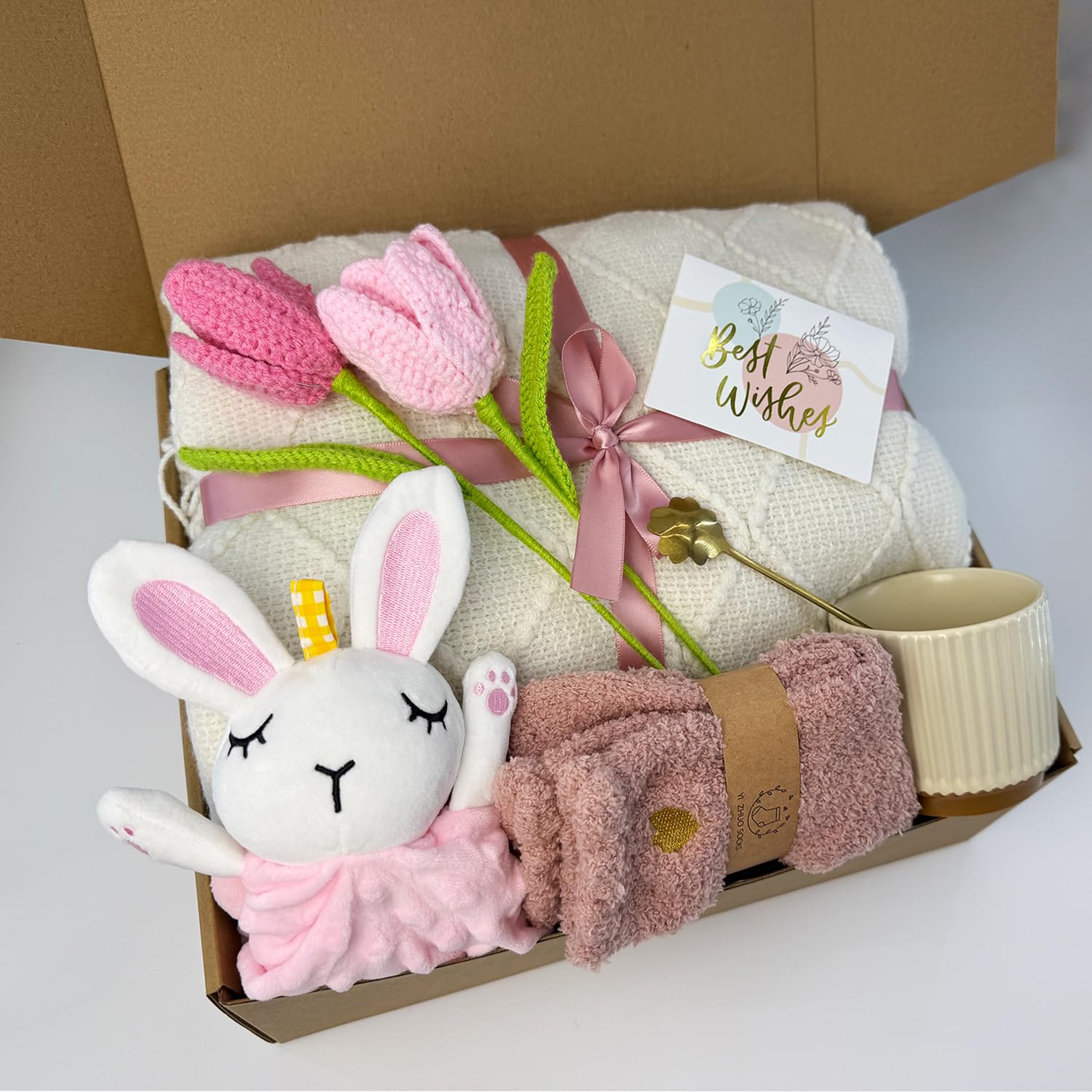 METICULOUSLY PAIRED NEW MOM GIFT BASKET – This carefully curated care package for new mamas is filled with items she’ll cherish and actually use.It includes 1* Snuggly knitted tassel blanket ,1* Bunny lovey for Baby,1* Warm beige mug, 1* Pair of cozy socks for mom, 2* Two handcrafted pink tulip flowers.Wrap her in cherished love with this thoughtfully curated new mom gift basket