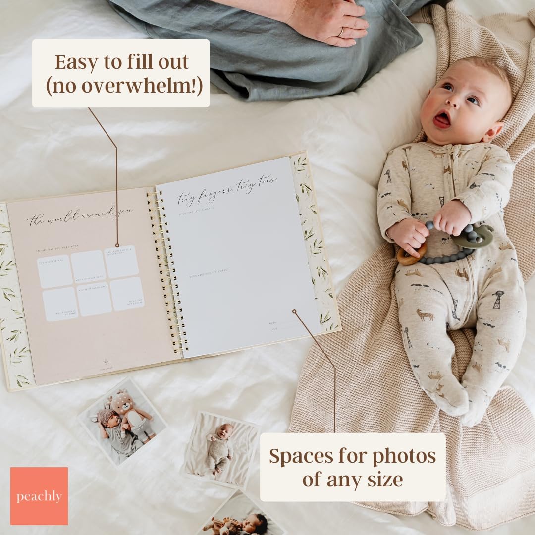 SIMPLE, EASY-TO-FILL GENDER NEUTRAL BABY BOOK: Say goodbye to baby memory books that are impossible to finish (goodbye, guilt!). This is the baby record book you’ll actually finish, in your sneaked-in, quiet moments. This Peachly baby first years book contains simple, open-ended prompts so you won’t be racking your brain, forcing yourself to write about milestones that don’t mean anything to you – ain’t nobody got time for that!