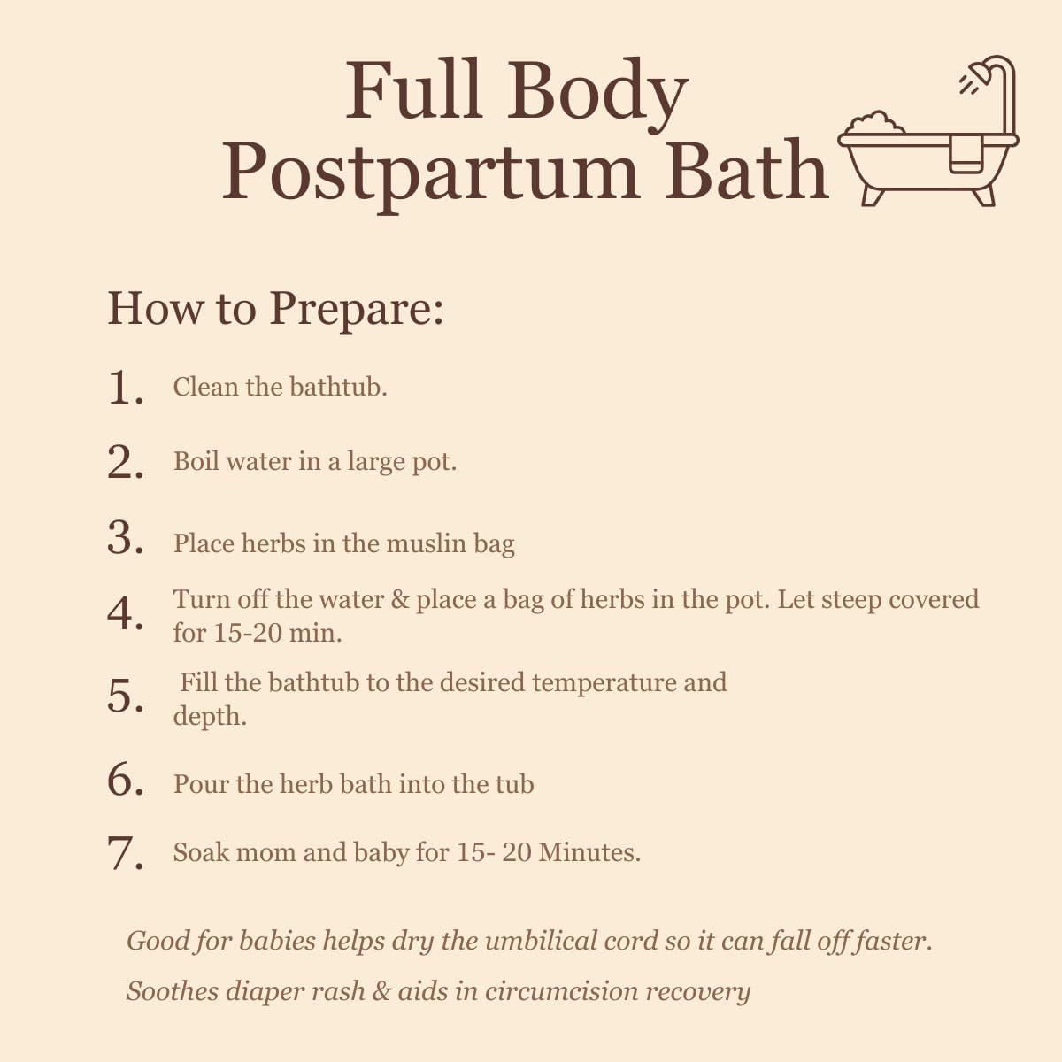 NATURAL AFTER CHILDBIRTH CARE our herbal bath provides postpartum mothers with a relaxing and soothing experience after childbirth and delivery. Also works well to dry and care for baby’s umbilical cord area. Take 3-5 baths after birth for general discomfort or relief.