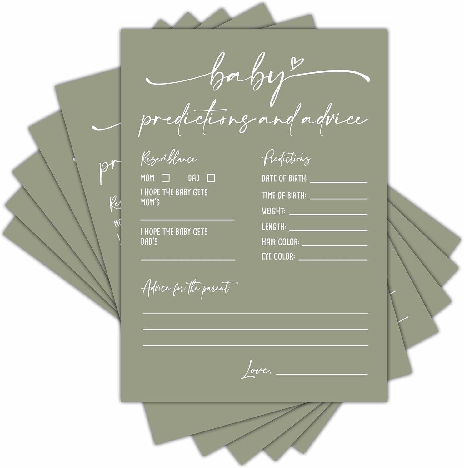 【Dimension】Package including 30 pieces Double-Side Baby Prediction and Advice Game Cards, Each card measures 5 * 7 inches. 【Premium Material】Baby Prediction and Advice Game Cards are made from sturdy and durable materials, so that you will get a smooth writing experience. 【Fashion Design】Let’s start your baby shower with these exquisite baby prediction and advice game cards! With such abundant gender reveal supplies, your gender reveal party would comes as a bash, every guest would be involved in and deeply impressed. 【A fun baby shower activity】Add loads of fun to your baby shower by asking your beloved guests to fill out these cute baby prediction cards with their opinions and advice. Not only will they have a blast doing so, but you will have the time of your life reading them as well!