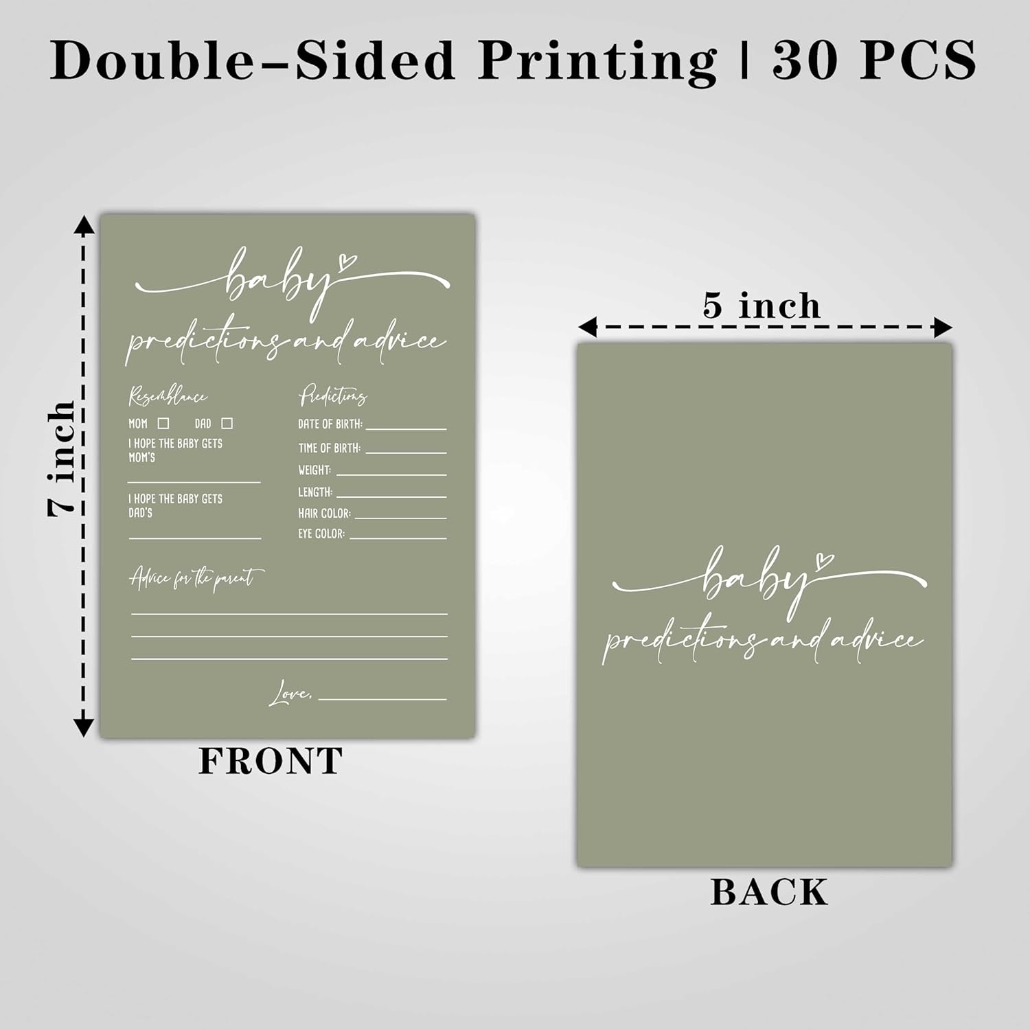 【Dimension】Package including 30 pieces Double-Side Baby Prediction and Advice Game Cards, Each card measures 5 * 7 inches.