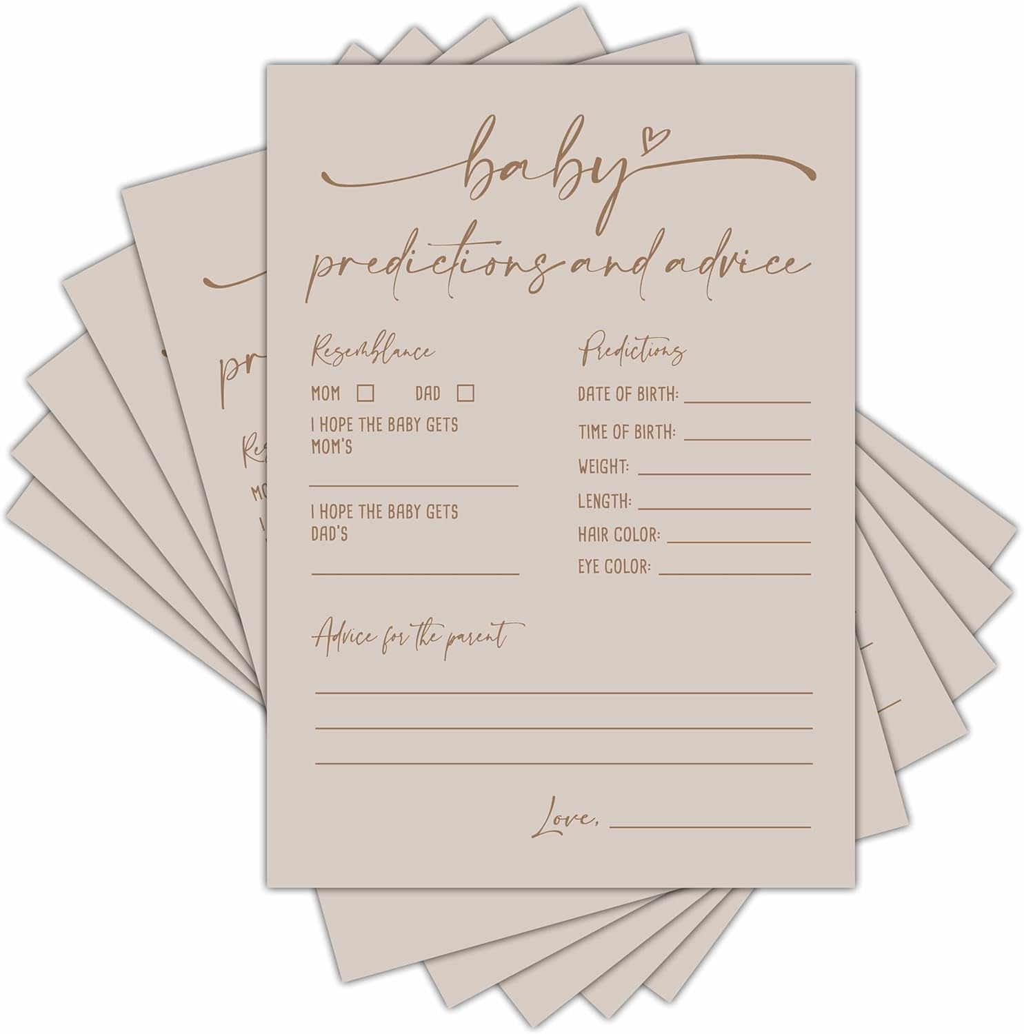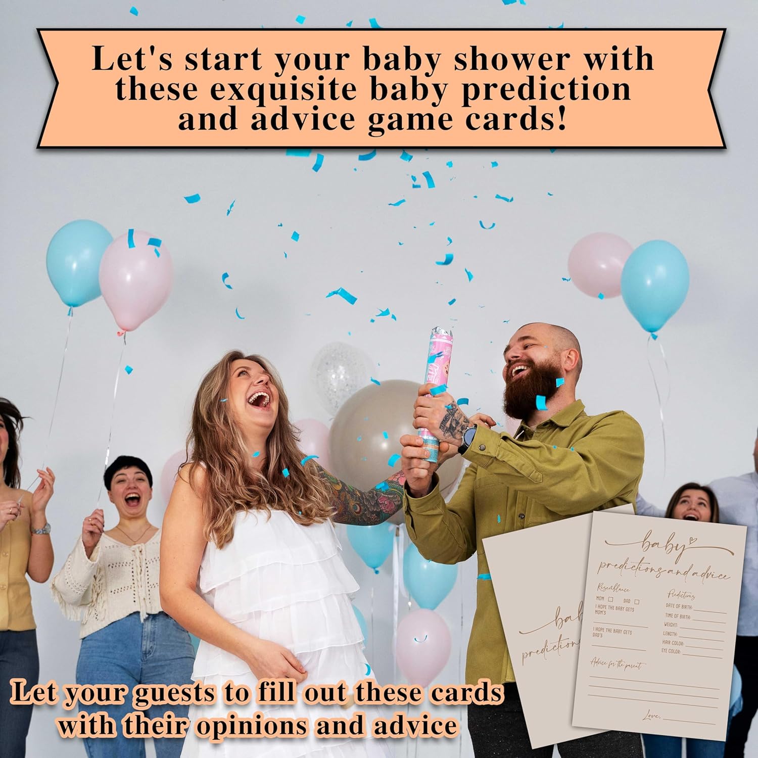 【Dimension】Package including 30 pieces Double-Side Baby Prediction and Advice Game Cards, Each card measures 5 * 7 inches. 【Premium Material】Baby Prediction and Advice Game Cards are made from sturdy and durable materials, so that you will get a smooth writing experience. 【Fashion Design】Let’s start your baby shower with these exquisite baby prediction and advice game cards! With such abundant gender reveal supplies, your gender reveal party would comes as a bash, every guest would be involved in and deeply impressed. 【A fun baby shower activity】Add loads of fun to your baby shower by asking your beloved guests to fill out these cute baby prediction cards with their opinions and advice. Not only will they have a blast doing so, but you will have the time of your life reading them as well!