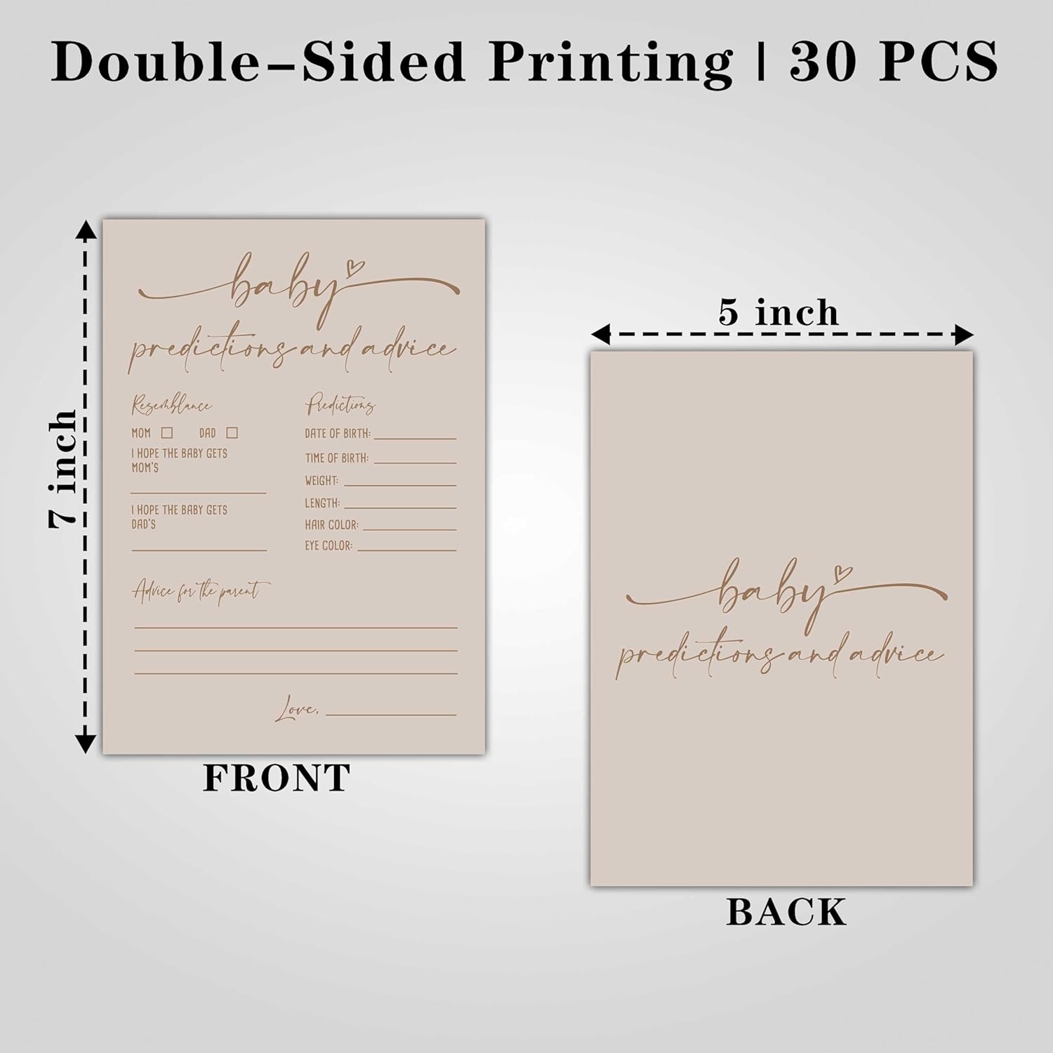 【Dimension】Package including 30 pieces Double-Side Baby Prediction and Advice Game Cards, Each card measures 5 * 7 inches.