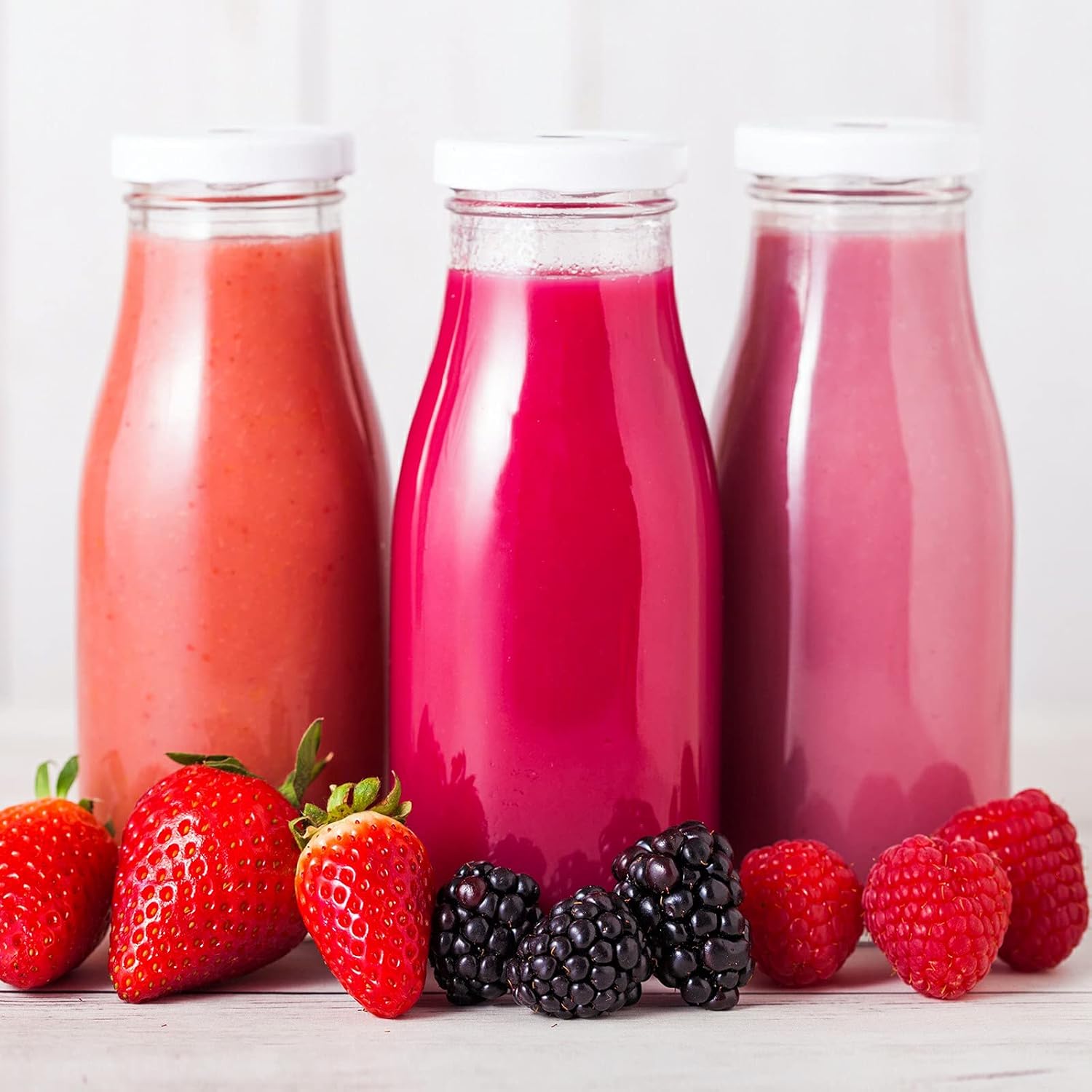 VALUABLE PACKAGE: Each milk bottle with lid is safely packaged in bubble wrap sleeves to prevent the breakage of our glass bottle milk during the shipping. The set includes 12 top quality glass bottles, 12 reusable white lids, additional 12 colorful lids with hole and 12 blue striped paper straws that can bring more value to your family and friends in any occasion.